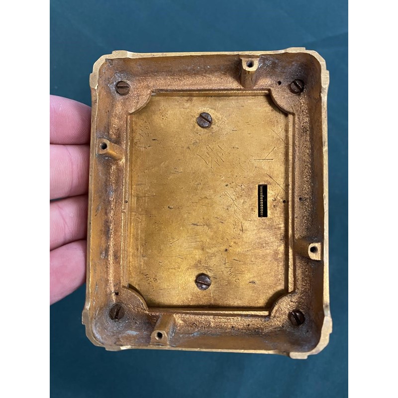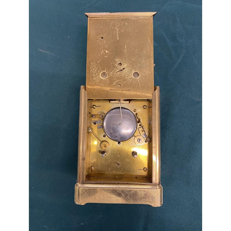 With a silvered rectangular dial with Roman numerals and subsidiary alarm dial, with a two train movement striking with two hammers on a bell, stamped '63, 75 M' and MOTTU A PARIES' to the back plate, the case with rising back engraved in English, 17cm high (handle up) 10cm wide 8cm deep. With key.