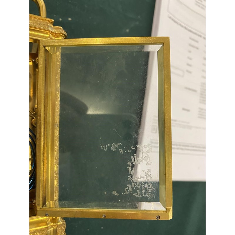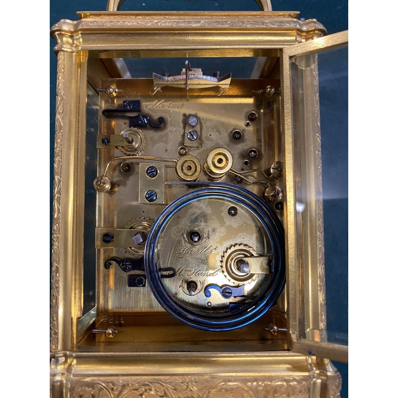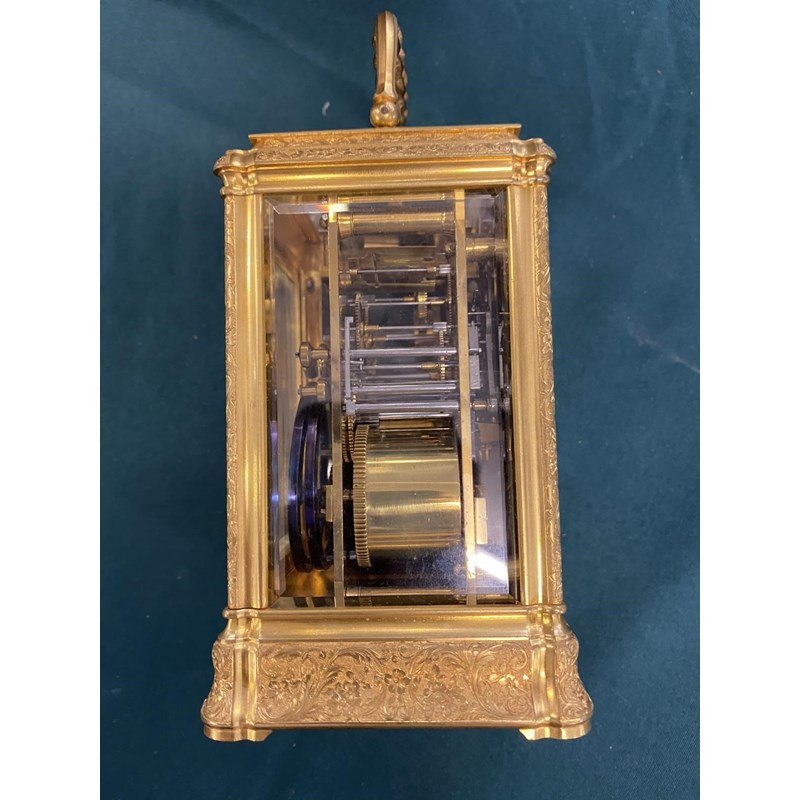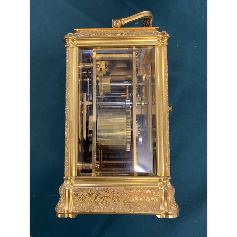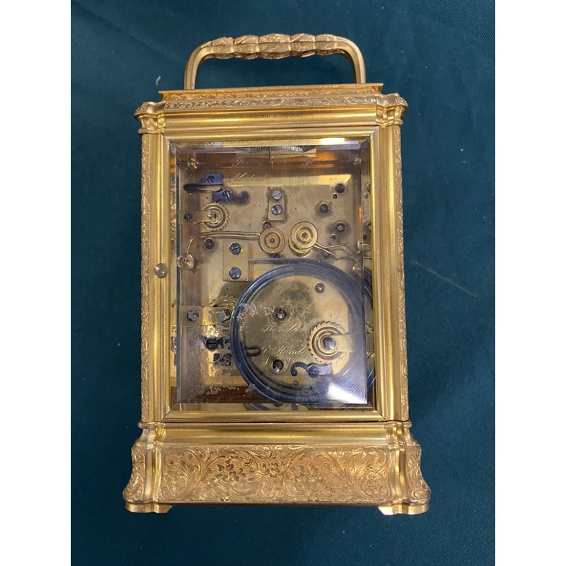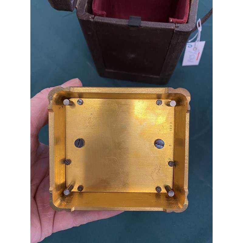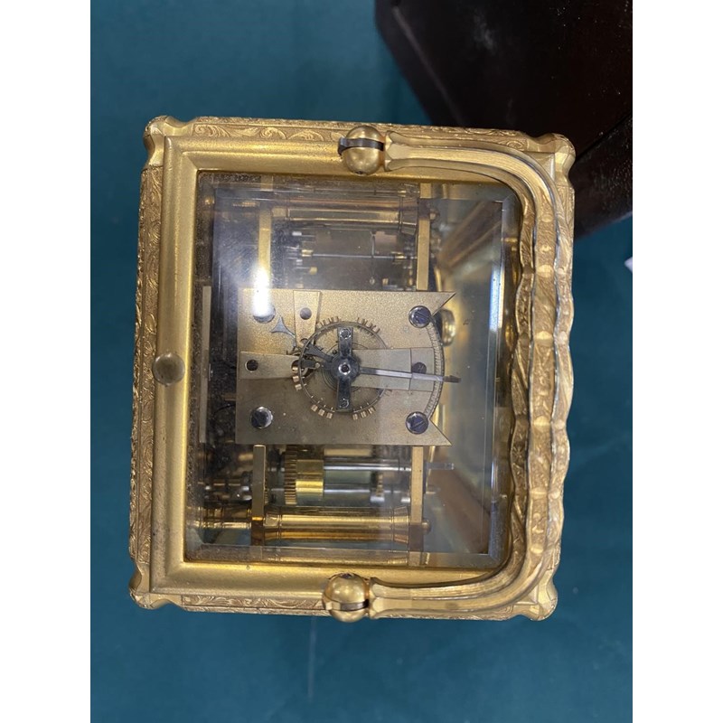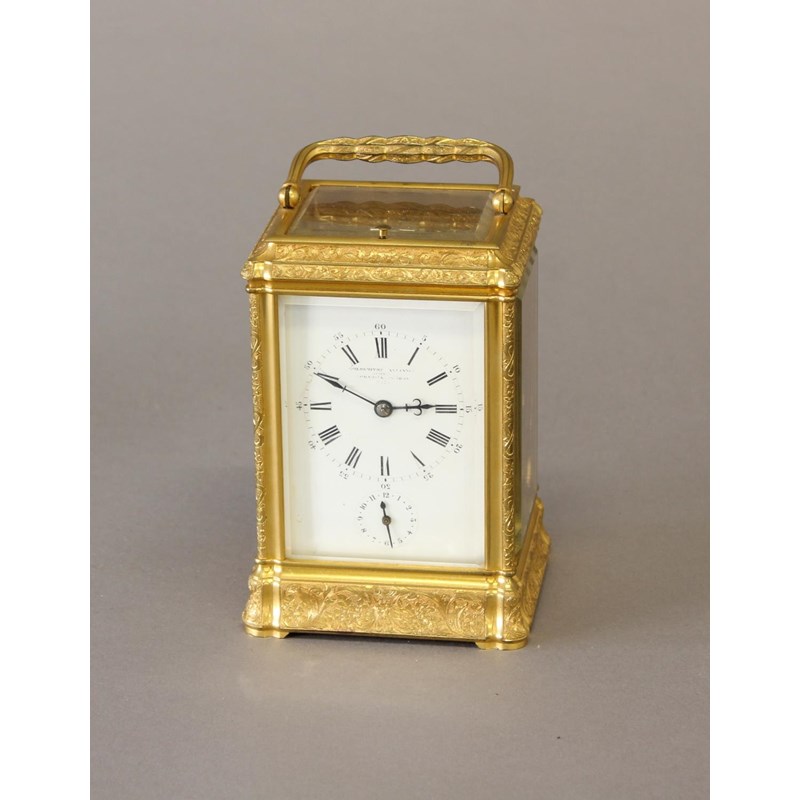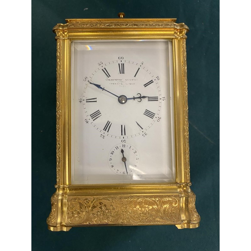 A 19th CENTURY FRENCH CARRIAGE CLOCK AND TRAVELLING CASE. With a rectangular white enamelled dial with Roman numerals and Arabic minutes above a subsidiary alarm dial, signed 'Goldsmiths Alliance Limited Cornhill, London, 2359' with a two train eight day movement with push button repeat striking on two coiled gongs, the back plate numbered 2359, the brass case with all over engraved scrolling foliate decoration, 17.5cm high (handle up), 9.5cm wide 8.5cm deep, in leather covered carrying case. No key.