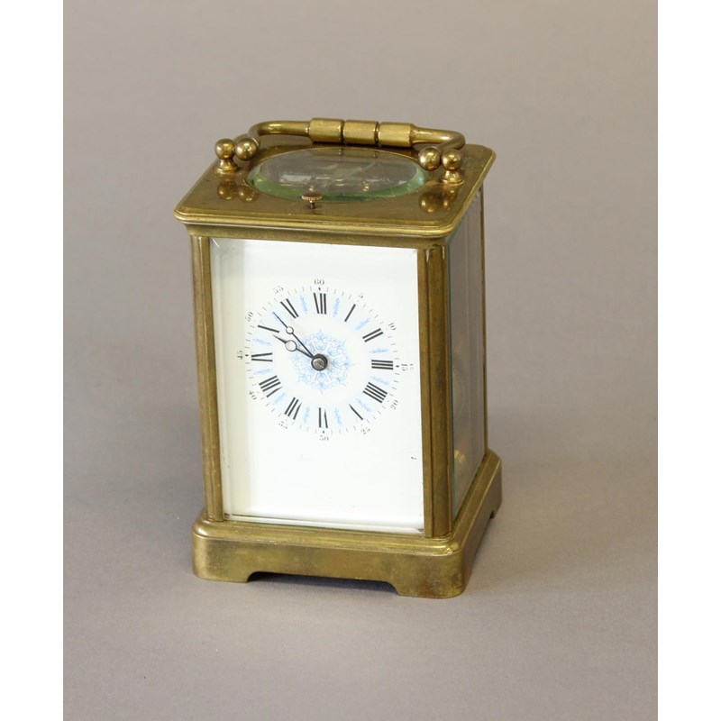 With a rectangular white enamelled dial with Roman numerals and Arabic minutes decorated with scrolling blue enamelled decoration, with an eight day two train movement striking on a coiled gong with push button repeat, the movement marked A star B and numbered 978 to the back plate and case, the dial indistinctly named AET.... Paris, 17cm high (handle up)9.5cm wide and 8cm deep. With leather covered travelling case and double ended key.