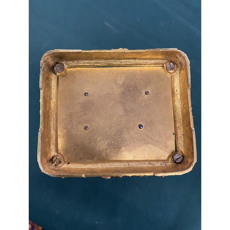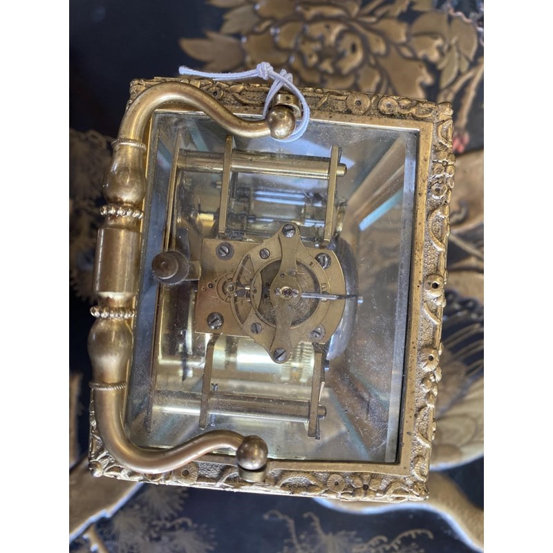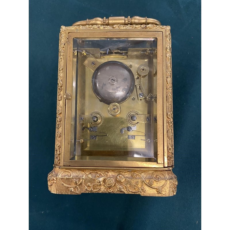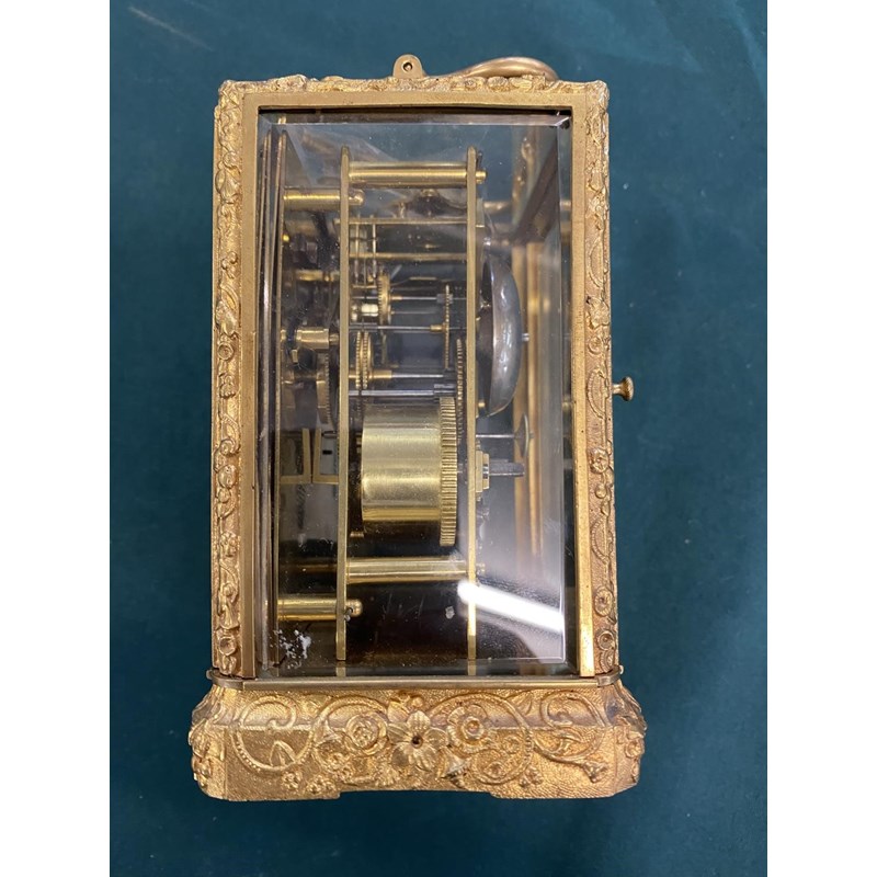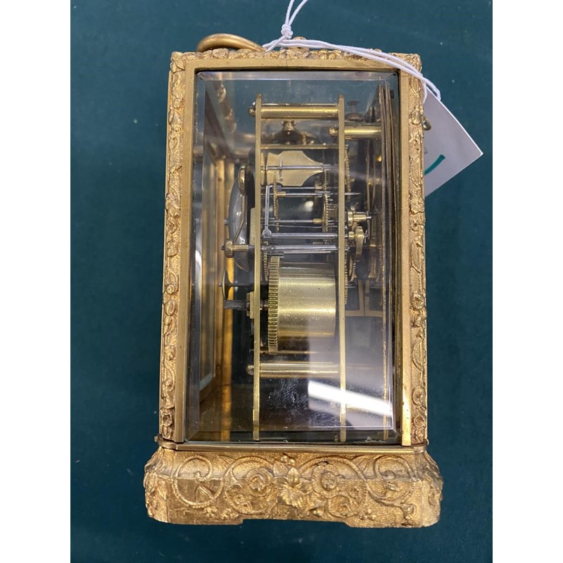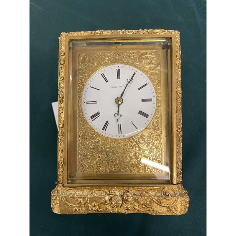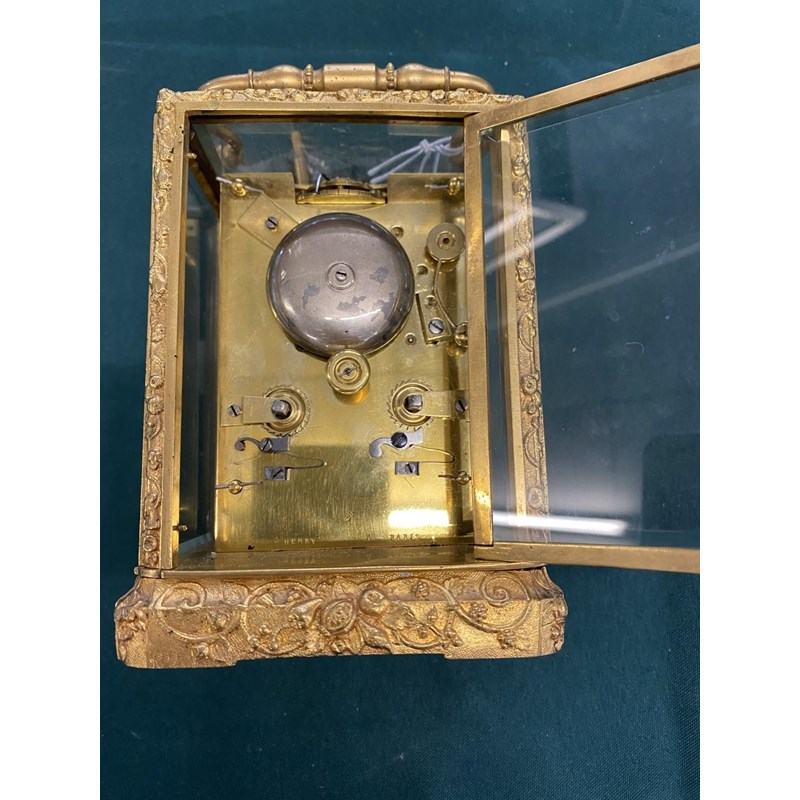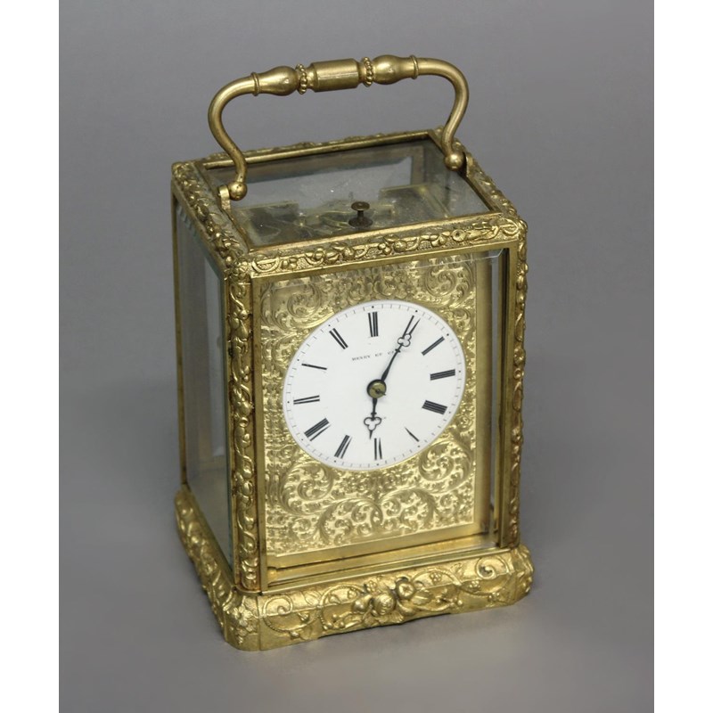 With a white enamelled dial with Roman numerals signed 'Henry et Cie', within a finely engraved surround of scrolls and flowers, with an eight day two train movement with push-button repeat striking on a bell, the backplate marked 'HENRY A PARIS'. the case with swing handle and cast gilt floral decoration throughout, 17cm high (handle up) 10cm wide and 8.5cm deep. With key.