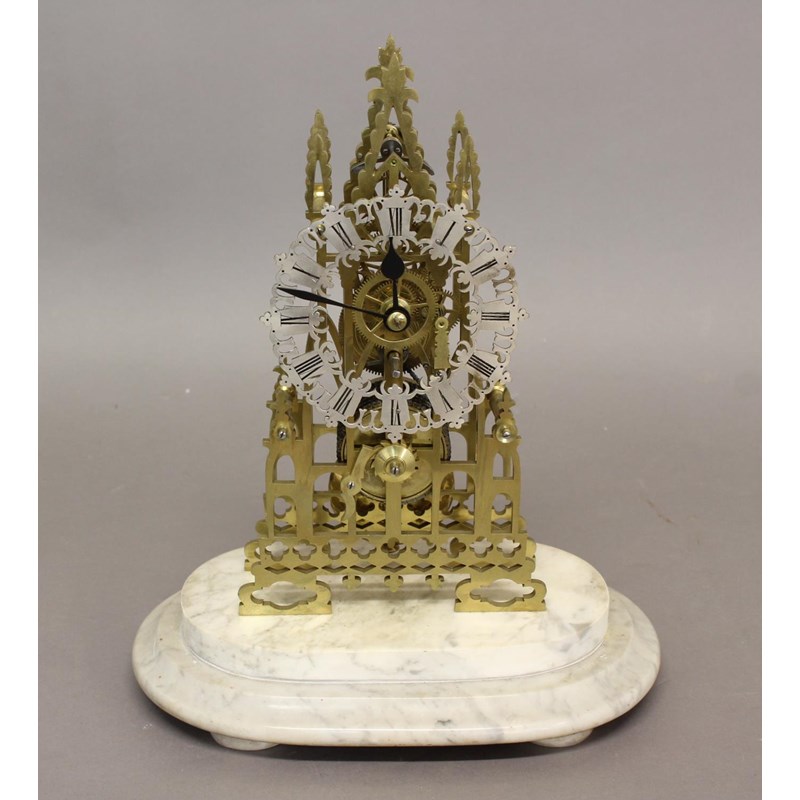 With a fretted chapter ring with Roman numerals, with an eight day single train chain fusee movement, between gothic style pierced architectural plates, on a stepped white marble base, 38cm high, 32cm wide, with pendulum and key.