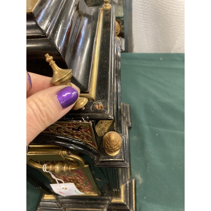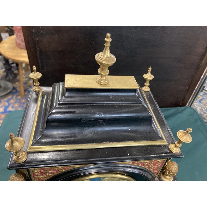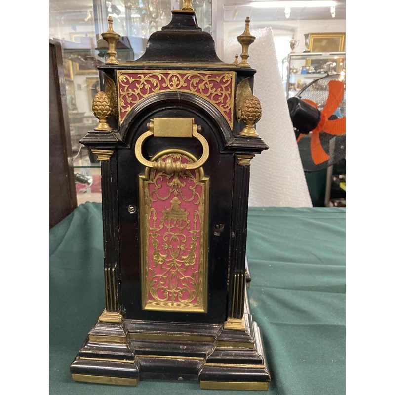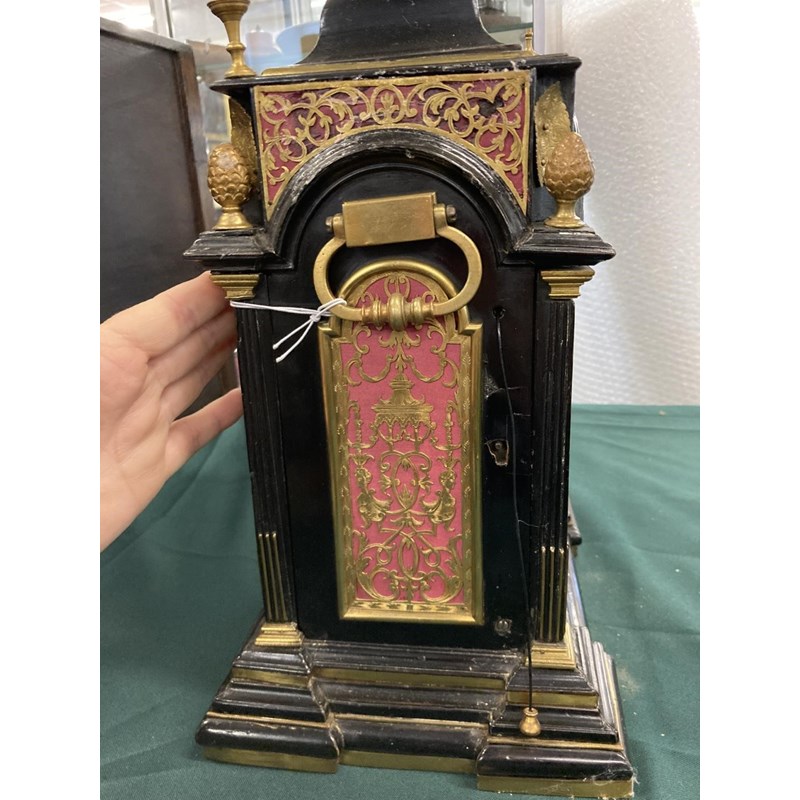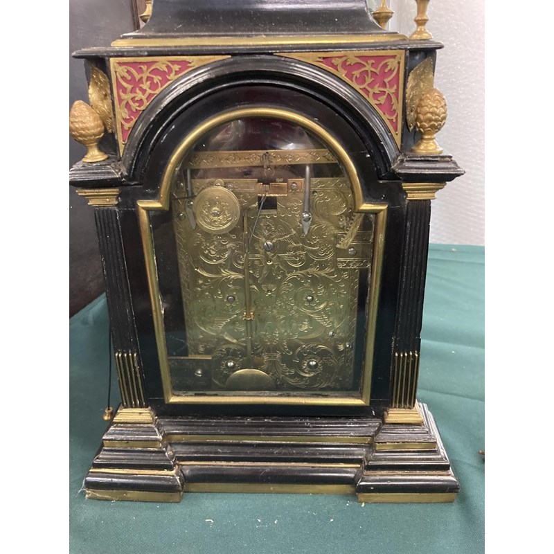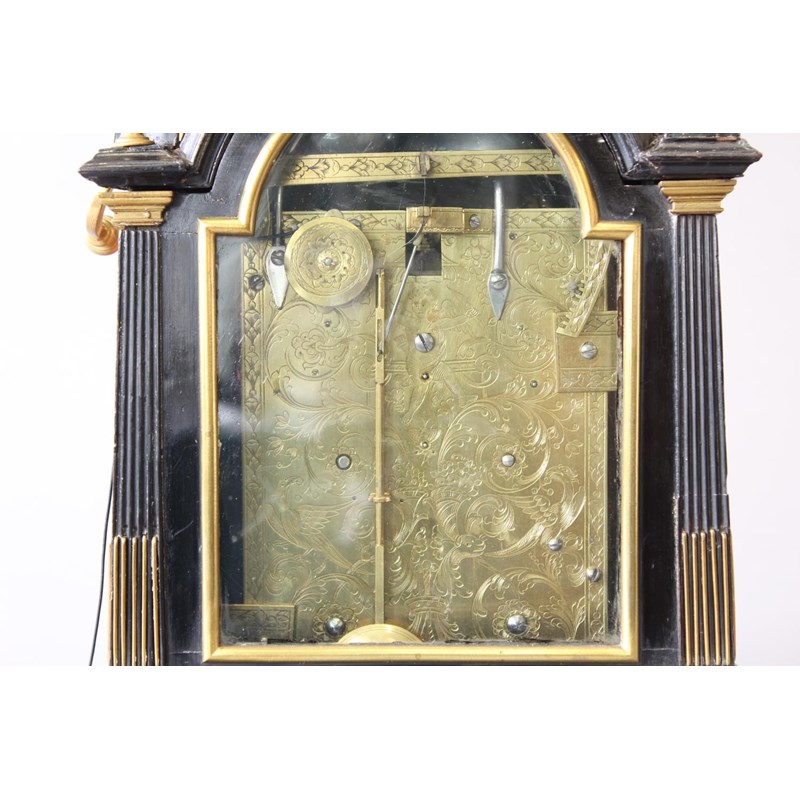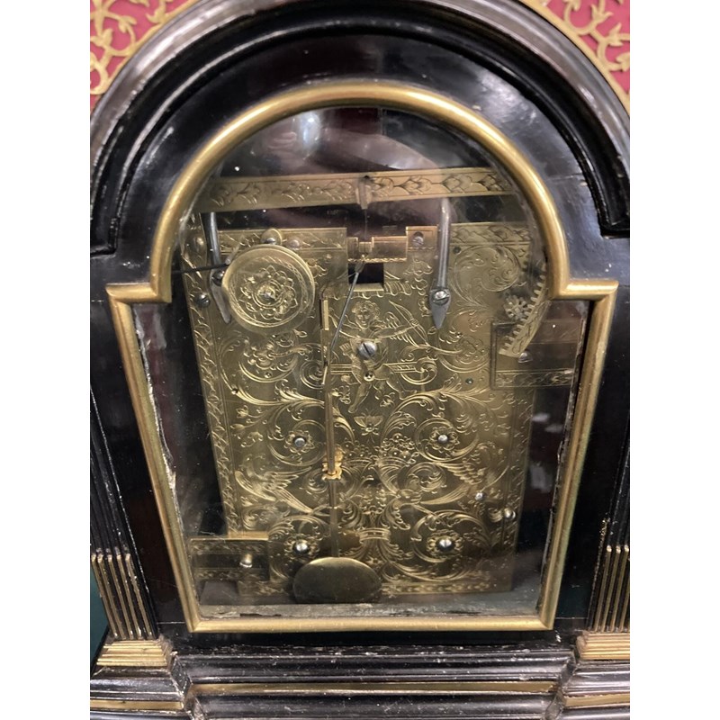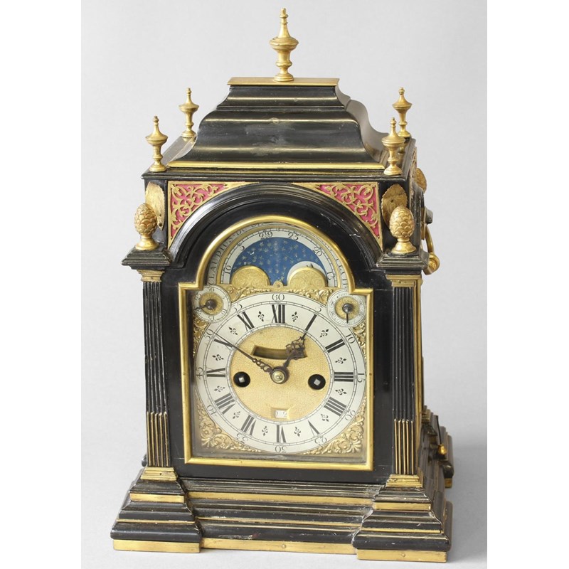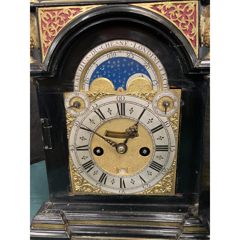 A late 17th or early 18th century bracket clock, with an arched dial with silvered chapter ring enclosing a matted ground with visible pendulum bob, twin winding holes and date aperture, with subsidiary date and 'Silence/Sonne' dial and moon phase beneath an arch 'Claudius Du Chesne Londini Fecit, the dial 19.5cm x 13.5cm. With a two train fusee movement striking on four bells and an hour bell with pull repeat, with verge escapement and beautifully engraved back plate with cupid holding a bow and arrow amongst scrolling foliage and exotic birds. The ebonised case with all over gilt mounts and twin carrying handles, the raised top with a central finial, surrounded by four lower finials, the arch topped glazed door beneath brass fret panels and stop fluted square fronted columns, on stepped base, the sides with pierced brass panels. 41cm high, 26.5cm wide, 20cm deep.