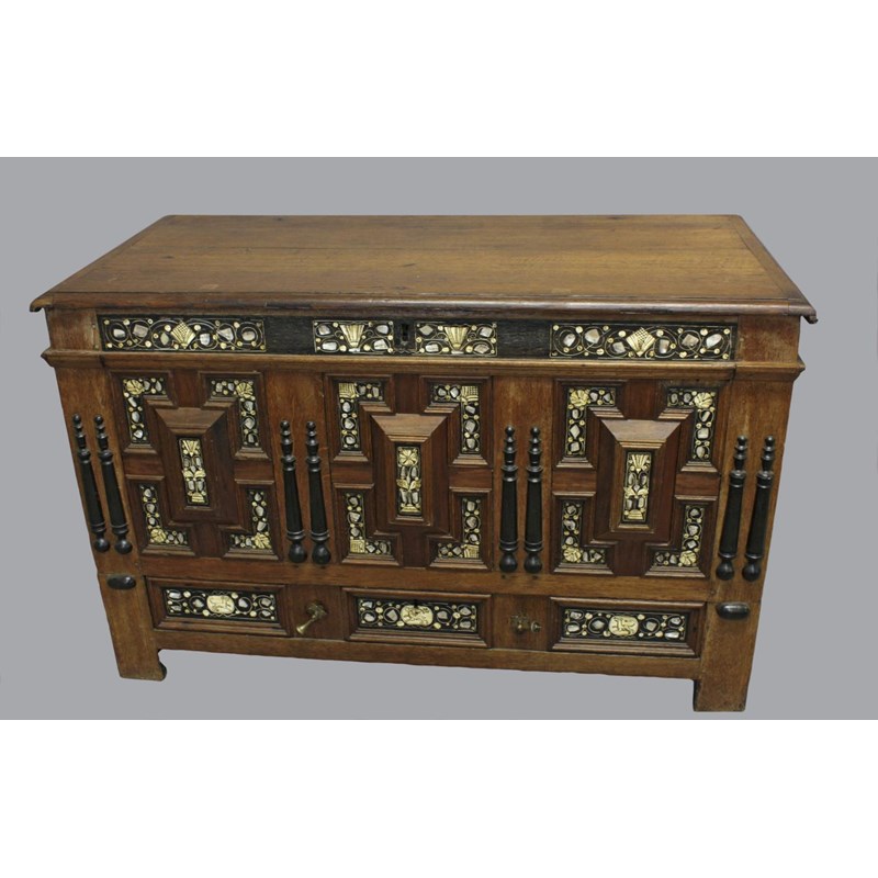 A 17TH CENTURY BONE AND EBONY INLAID COFFER.