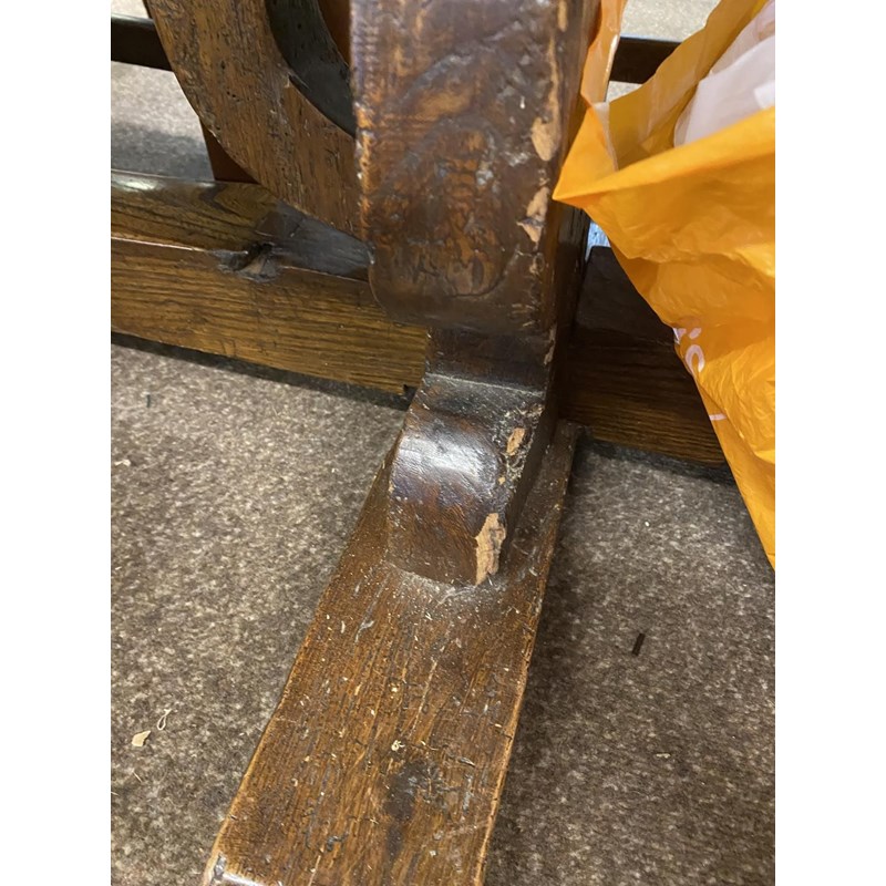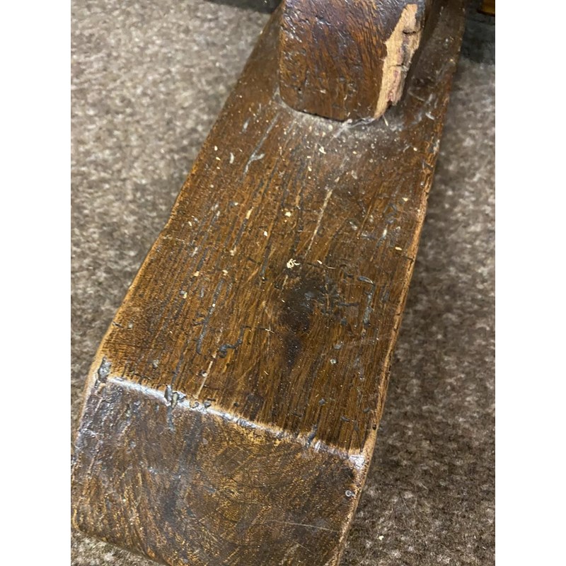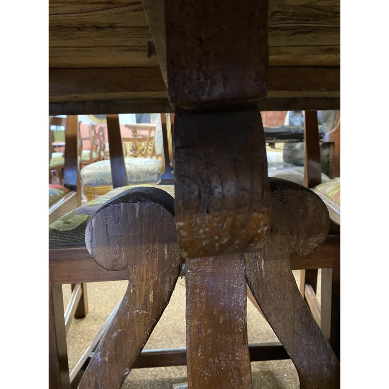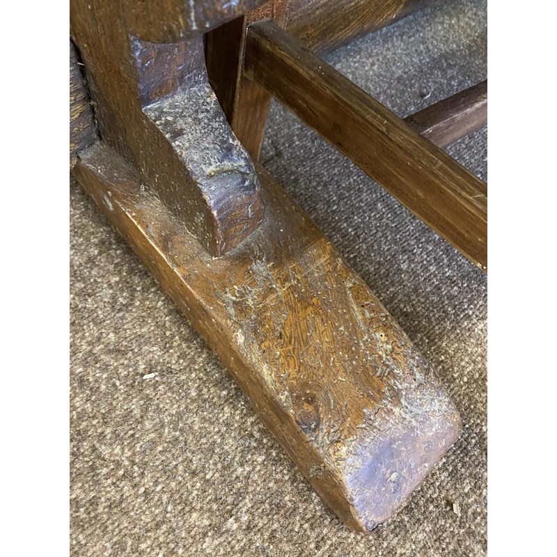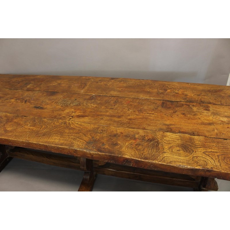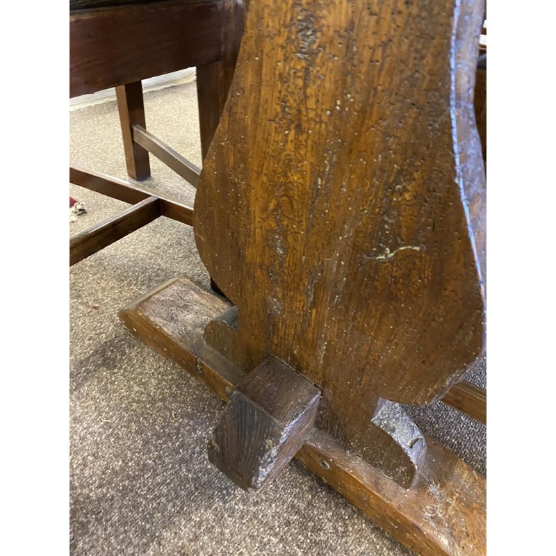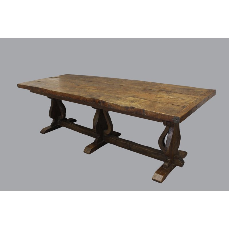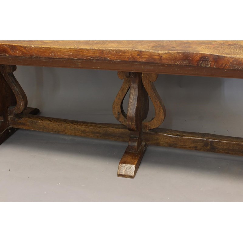 With a broad three plank top with clamped ends, on twin trestle end supports with conforming central open form support, with a broad central cross rail and three platform bases, 78cm high, 240cm long and 93cm wide.