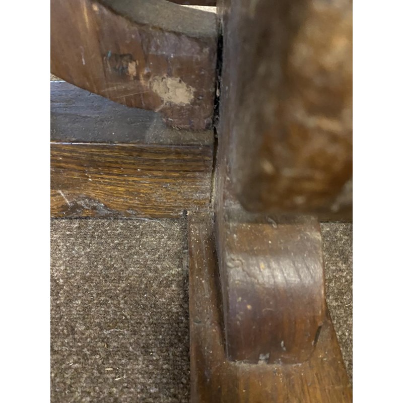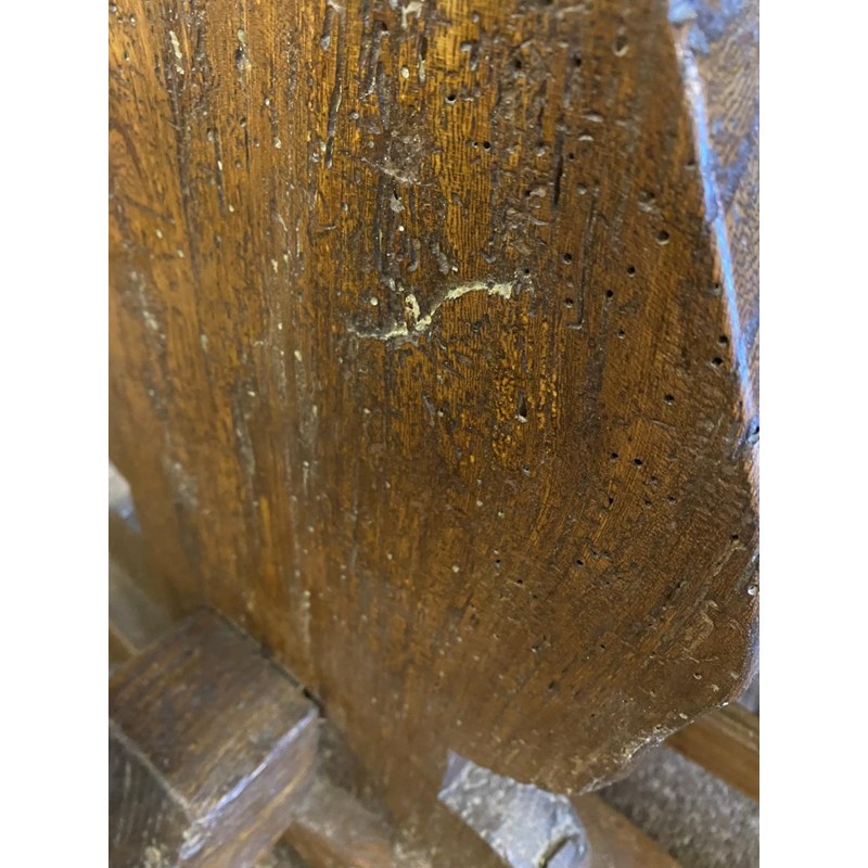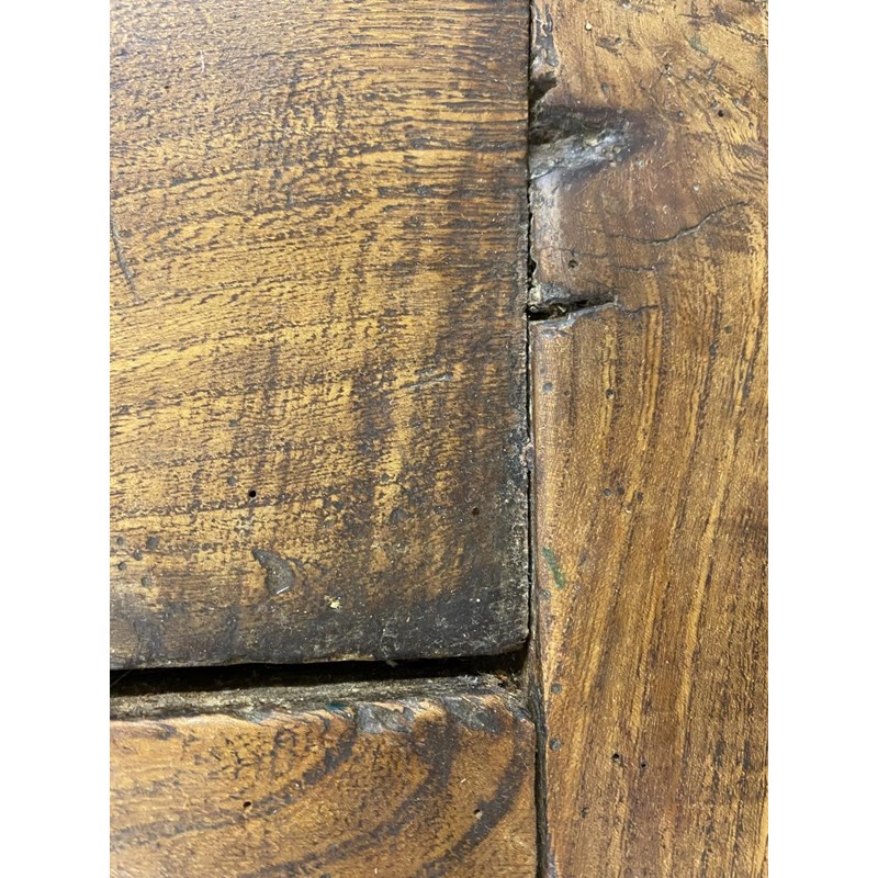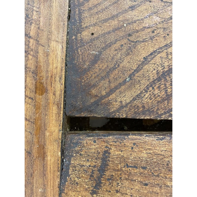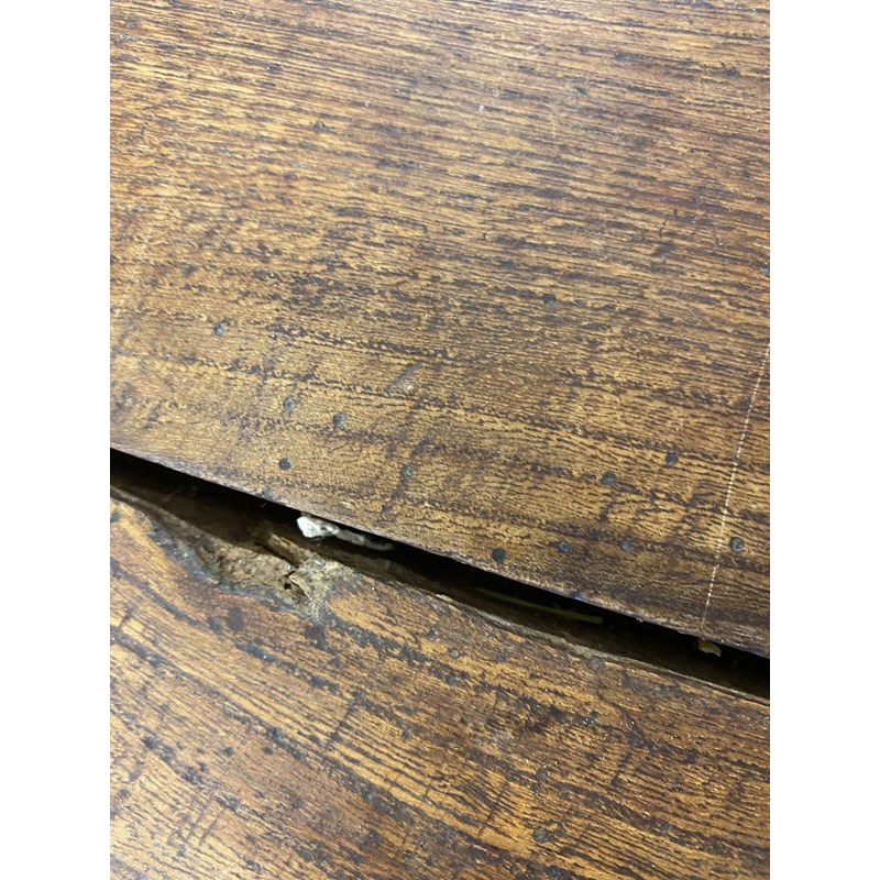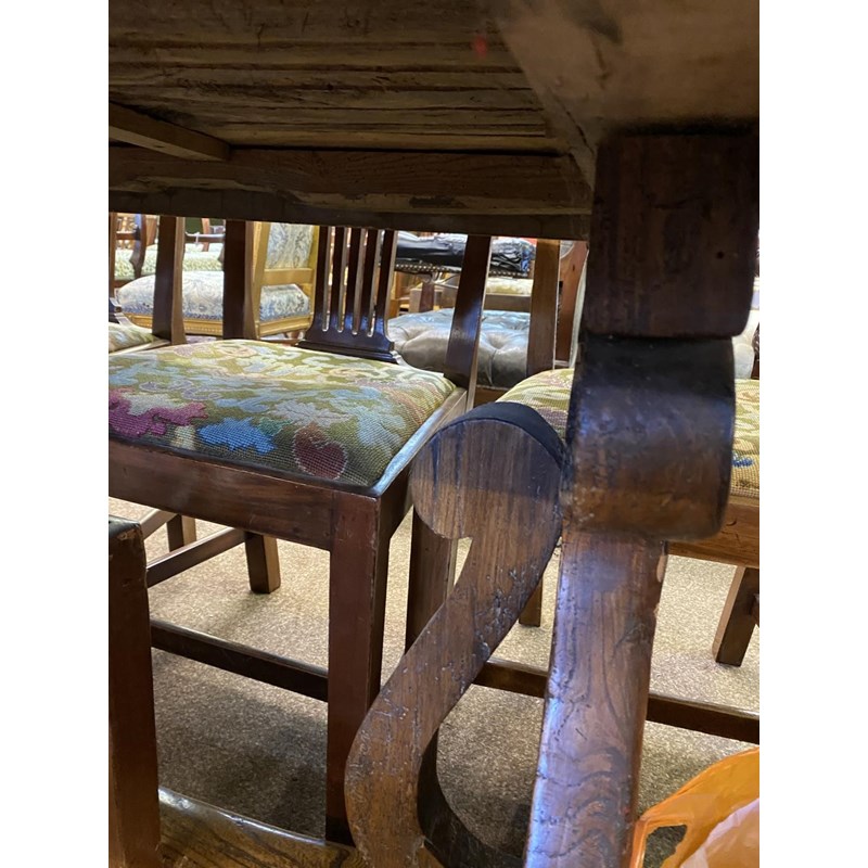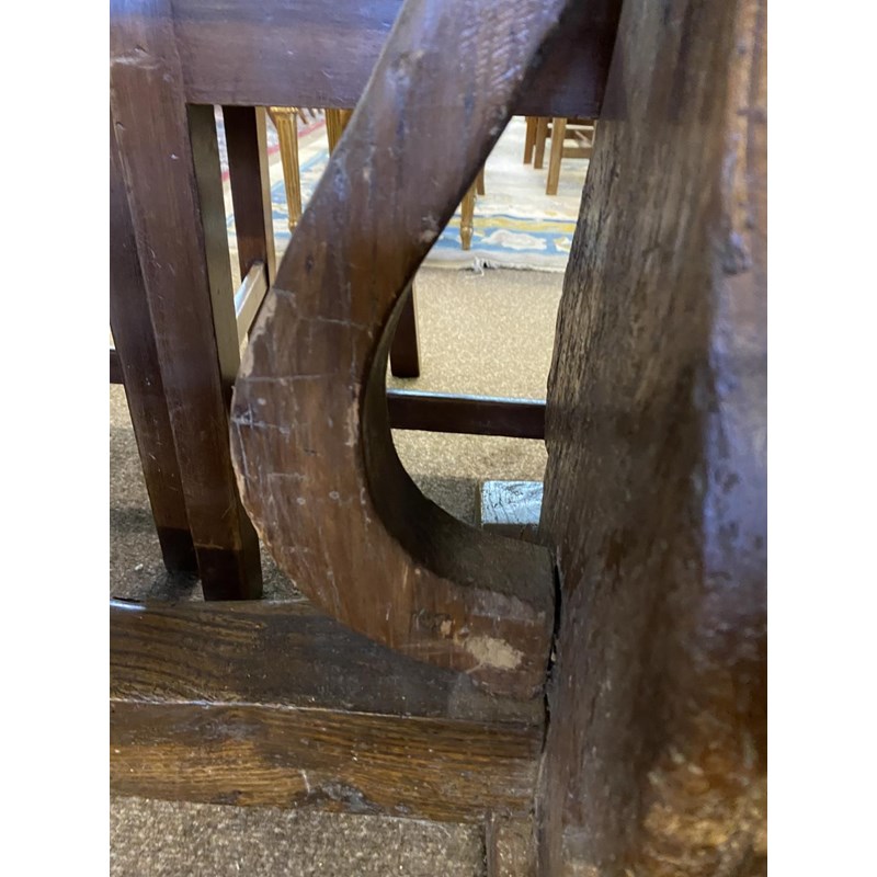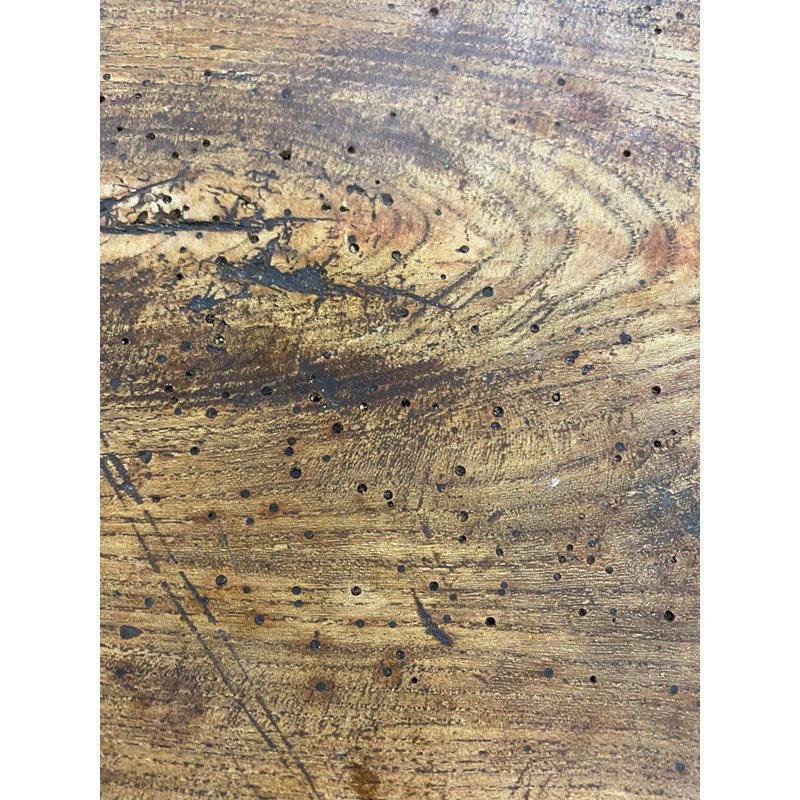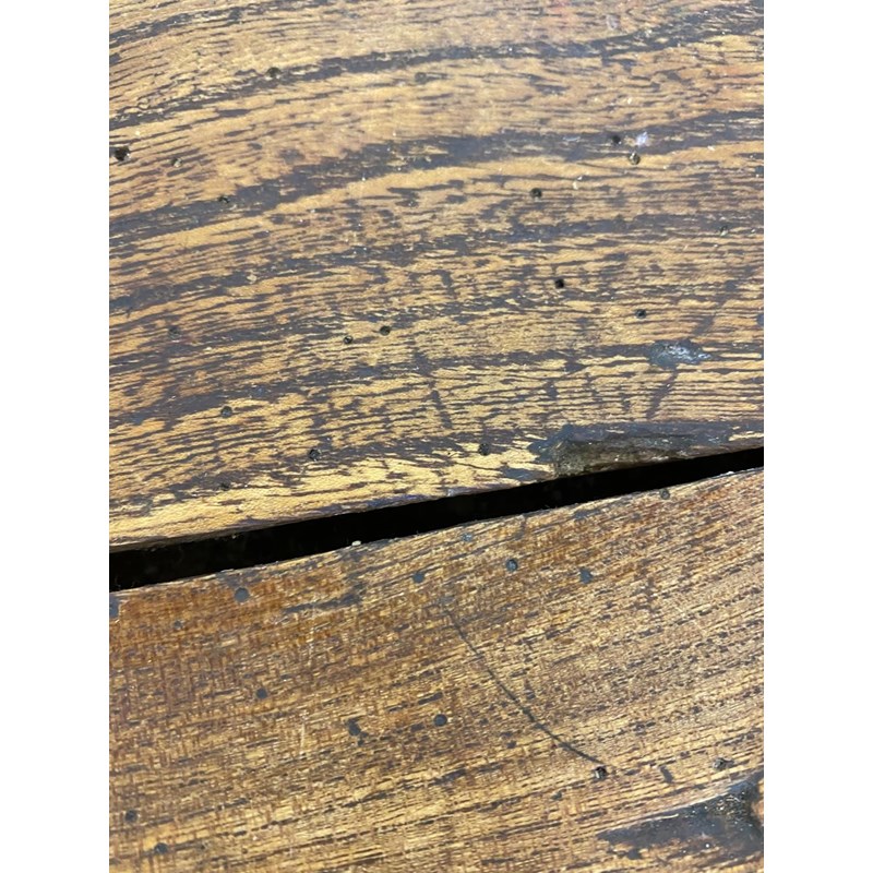 With a broad three plank top with clamped ends, on twin trestle end supports with conforming central open form support, with a broad central cross rail and three platform bases, 78cm high, 240cm long and 93cm wide.