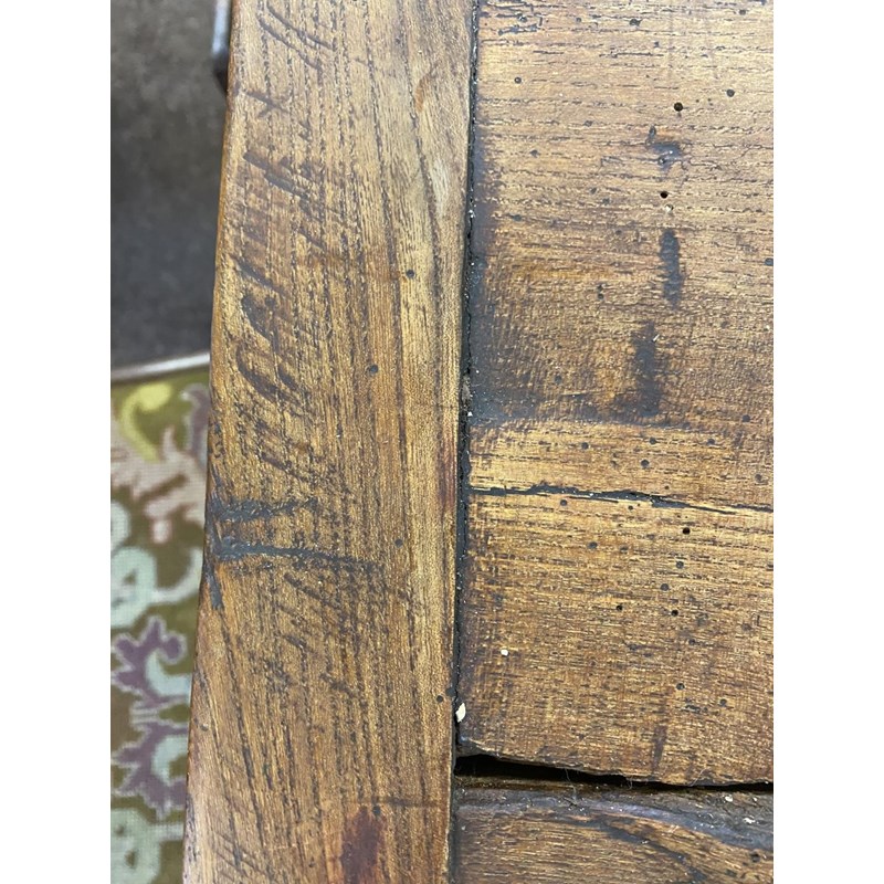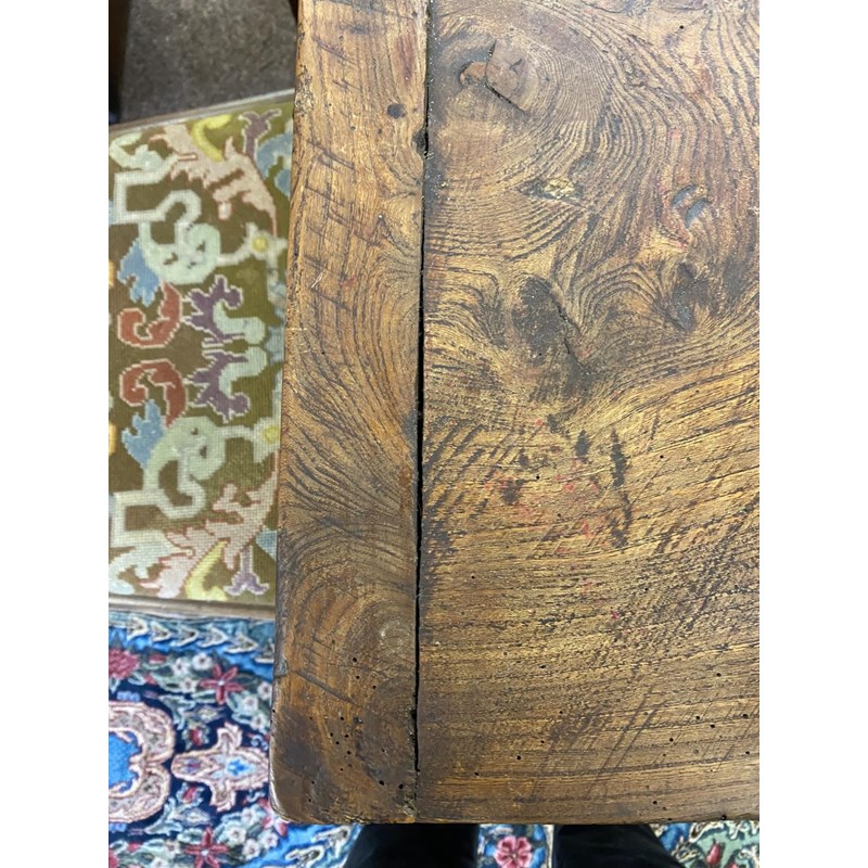 A 17TH CENTURY STYLE ELM TOPPED REFECTORY DINING TABLE.