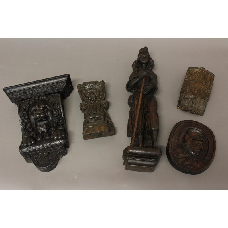 A carved standing figure of a female wearing a hat and holding a long staff, on small bracket, 48cm high 12cm wide, a carved oak bracket decorated with a roaring lion, 30 x 22cm, and three similar smaller panels. (5)
