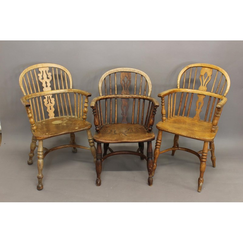 Each with arched backs, curved arm supports and a solid elm seats on turned legs and curved 'crinoline stretchers', 86cm, 90cm and 92cm tall, each with slightly differing splats and details.
