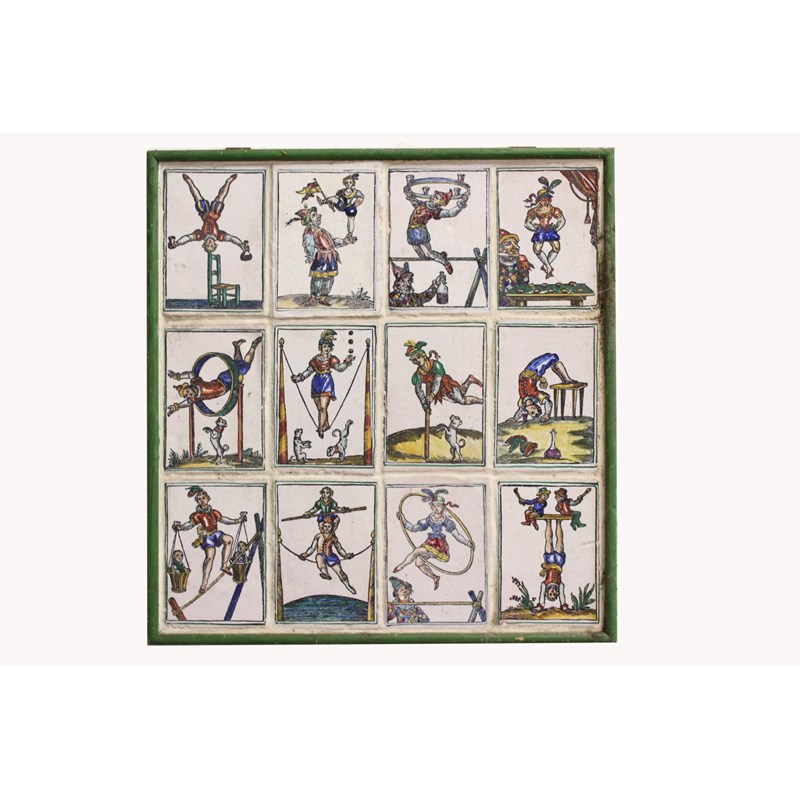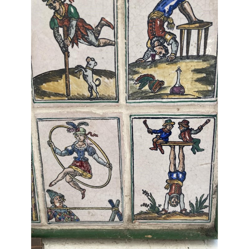 The twelve tin glazed tiles of performing acrobats attempting various pursuits, often accompanied by small dogs, the tiles each 18 x 13cm, 58 x 54cm overall.