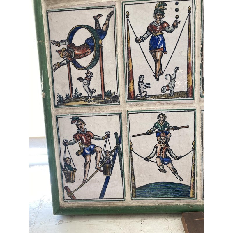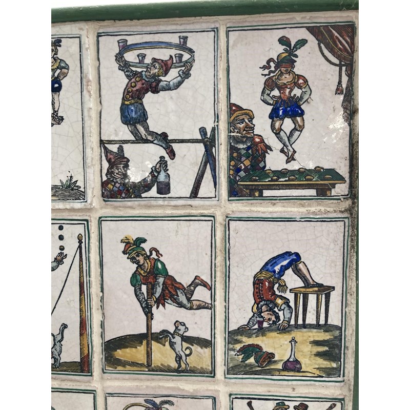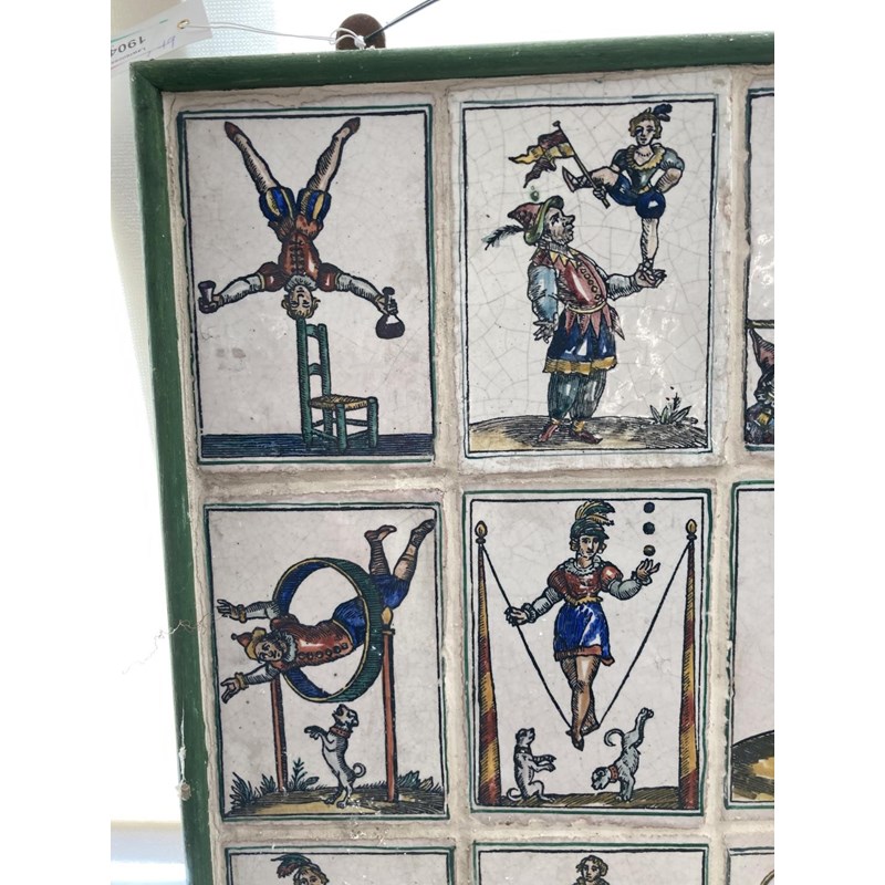 A FRAMED PANEL OF 12 CERAMIC TILES OF PERFORMING ACROBATS.