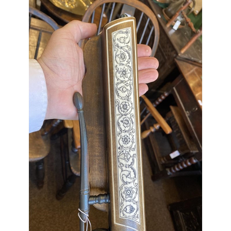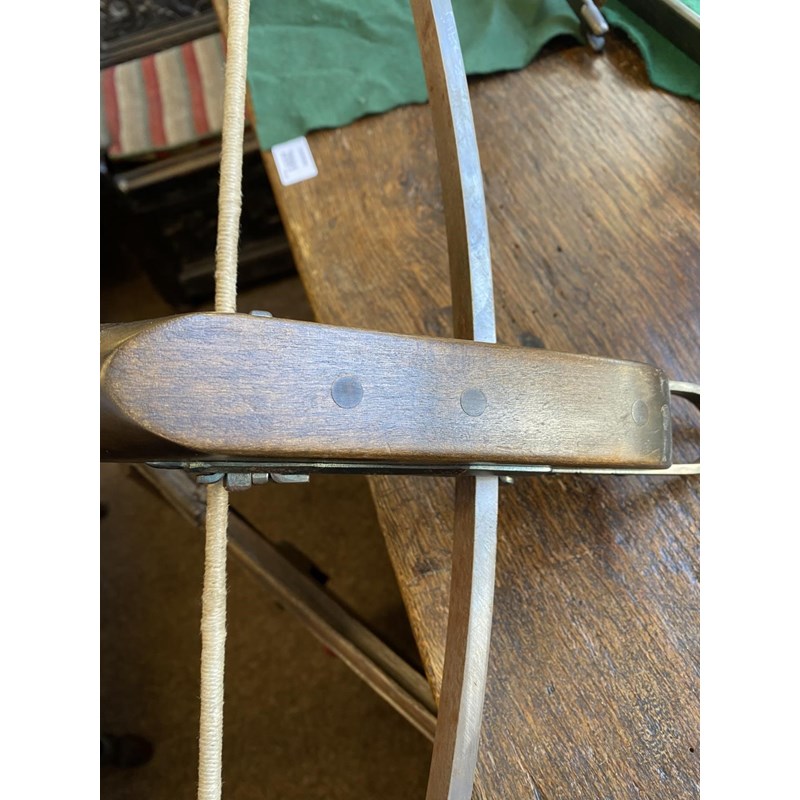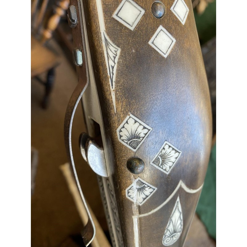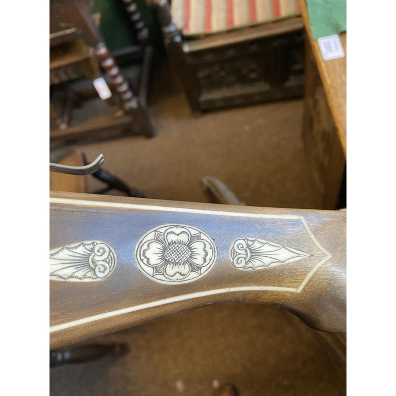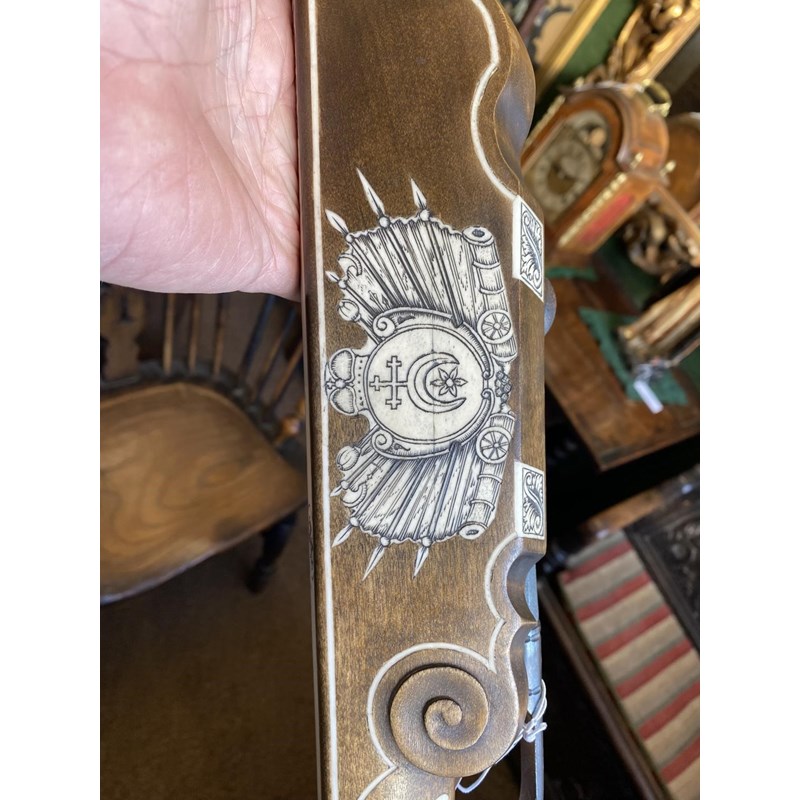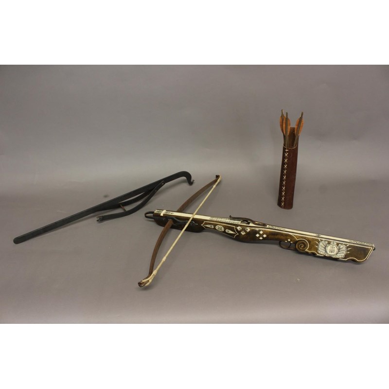 With all over engraved bone inlay decorated with foliate and armorial decoration, with steel bow and trigger, 72cm wide and 81cm long. With a loading device and a small collection of arrows in a quiver.