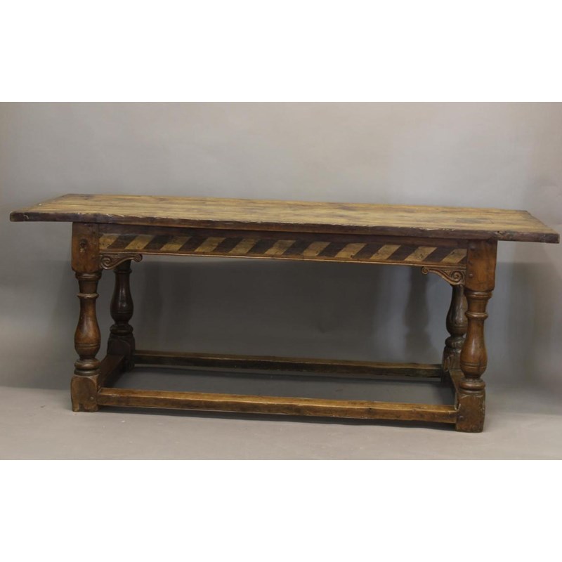 With a broad three plank top with shaped end rails, on a frieze with sloping geometric alternating light and dark marquetry veneers, scrolling carved corner brackets and heavy turned legs with rectangular stretchers with moulded edges,77.5cm high, the top 203 x 80cm