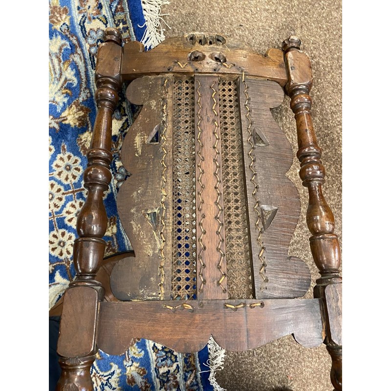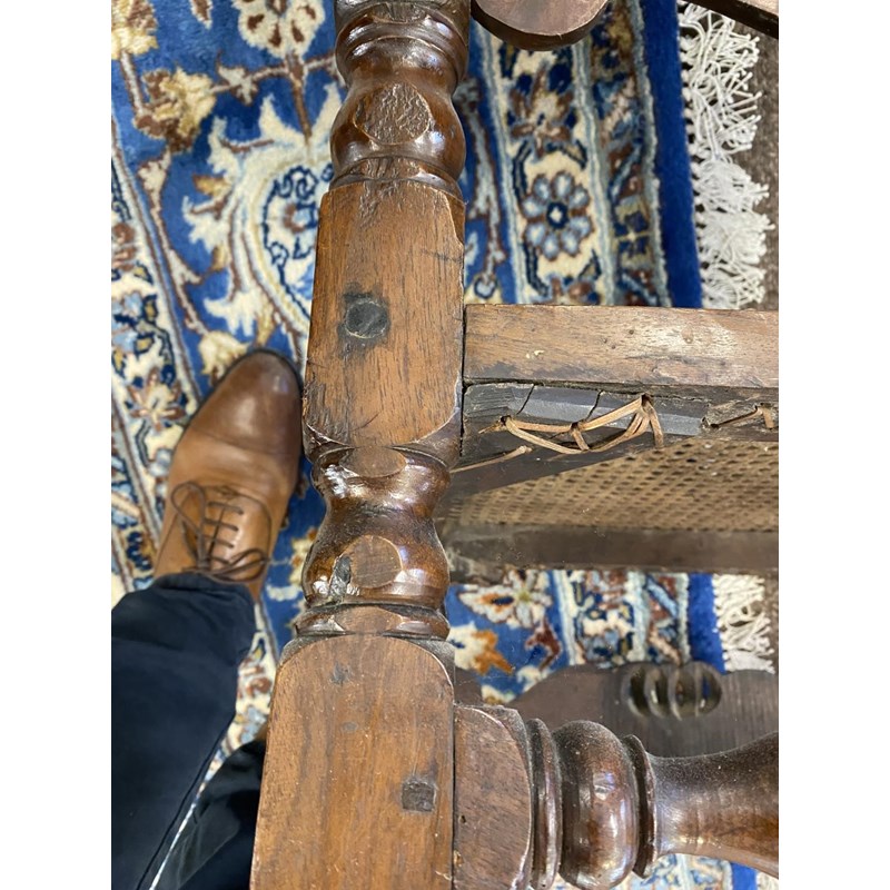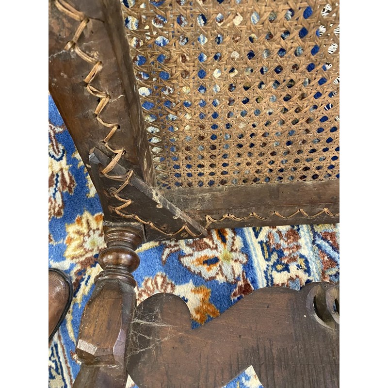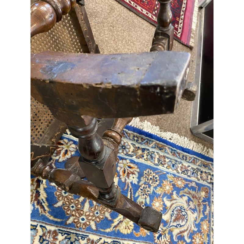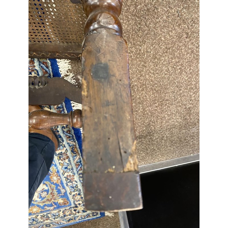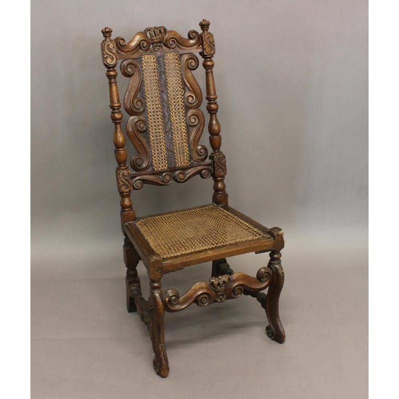 With a carved walnut framed with crown centred top rail, caned back and turned uprights, the caned seat in a moulded surround, with conforming crown carved rail and scrolling legs and turned stretchers, 107cm high.