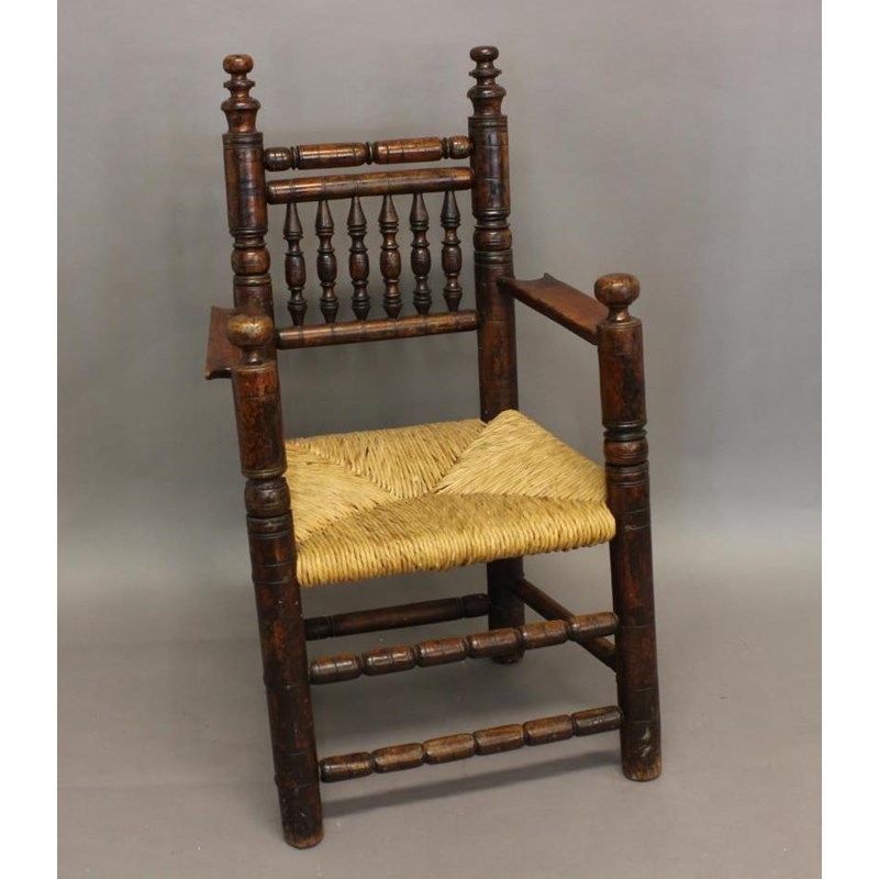 With heavy turned uprights, the rail back with six turned uprights, with shaped flat arm rests, rush seat and turned stretchers, 103cm high, 64cm wide and 46cm deep.
