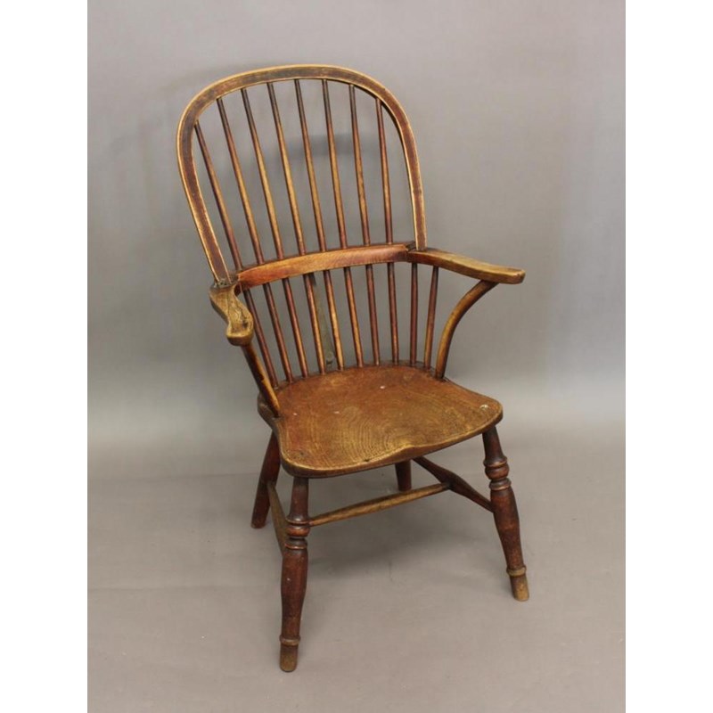 With a raised hoop back, three part arm and shaped elm seat, on turned legs and 'H' form stretcher, with traces of original red stained finish, 100cm high, 60cm wide.