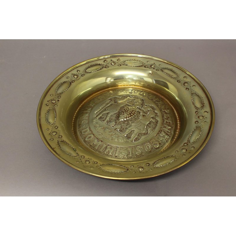 The centre embossed and engraved with two figures carrying a large bunch of grapes, within a Latin motto 'Ave Gratia Plena, Anno Domini 1503', all within a broad raised border, 7cm high and 46cm wide.