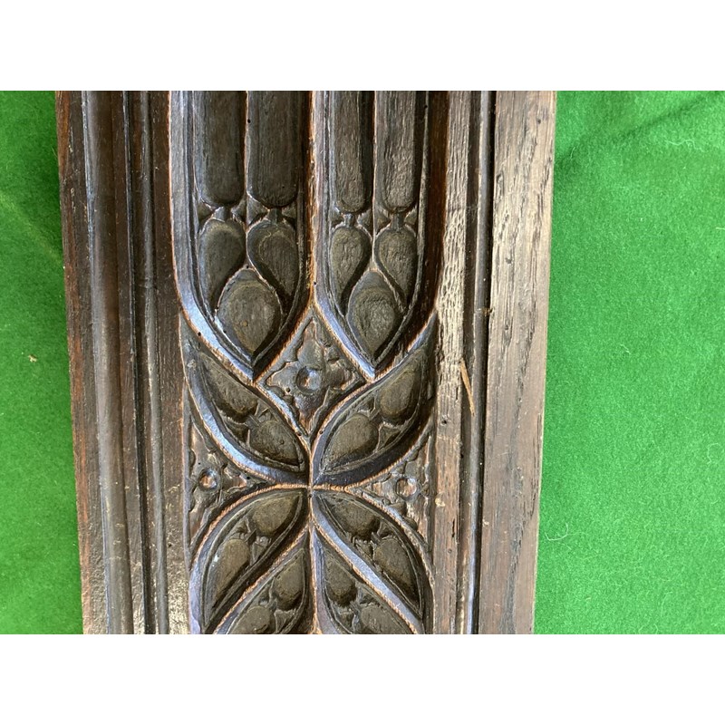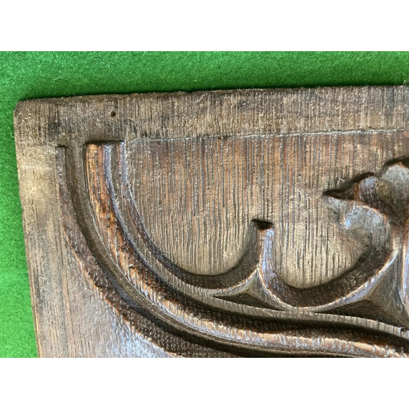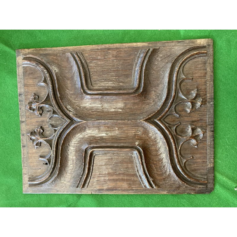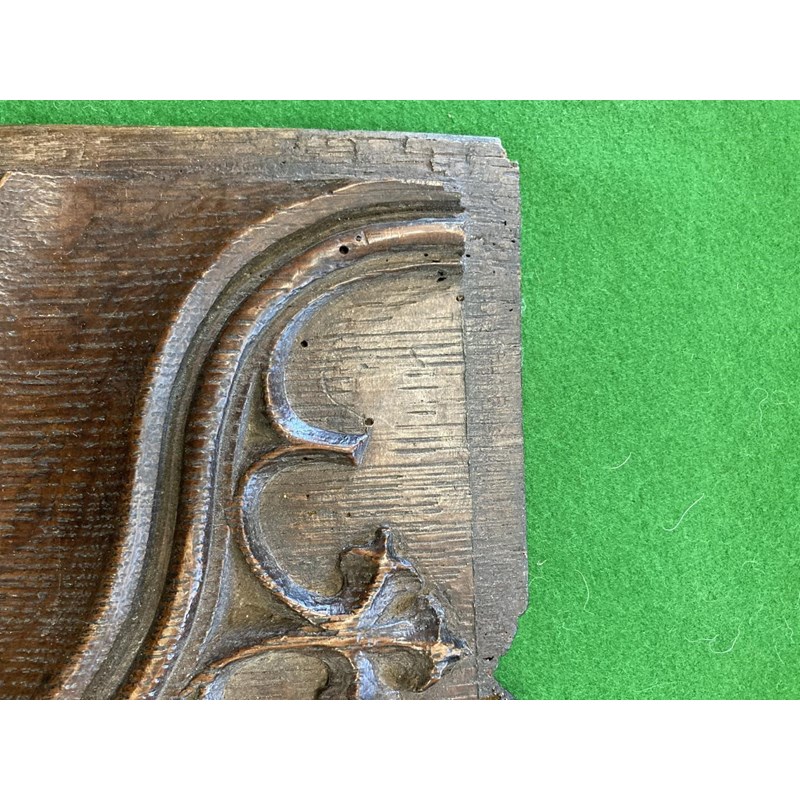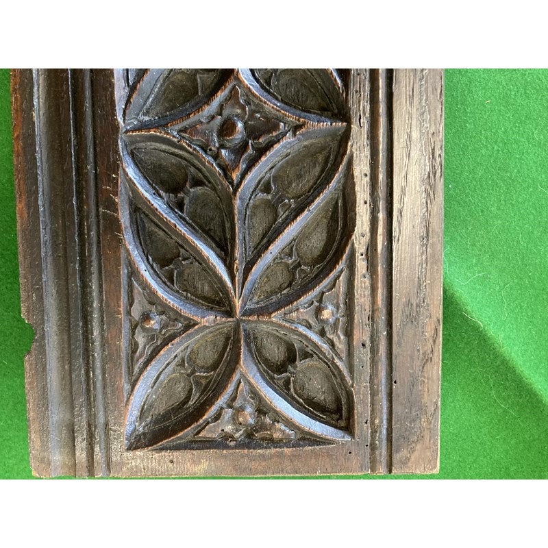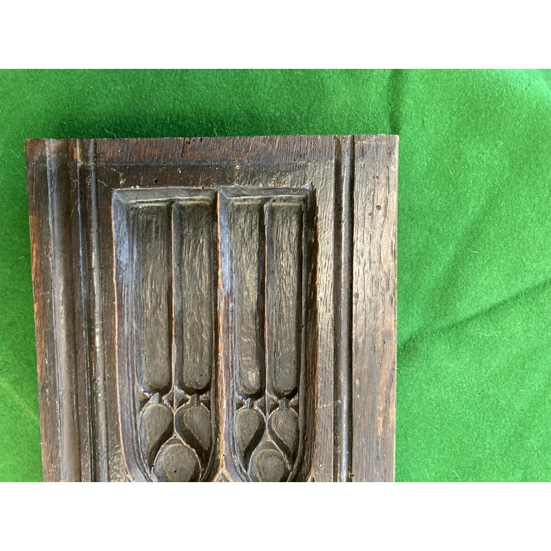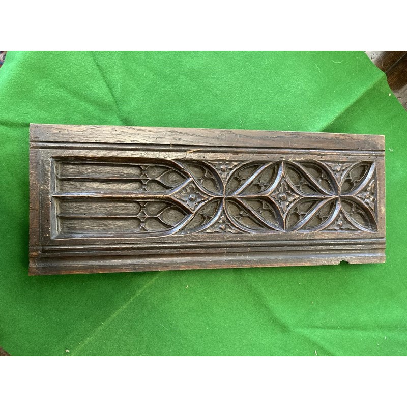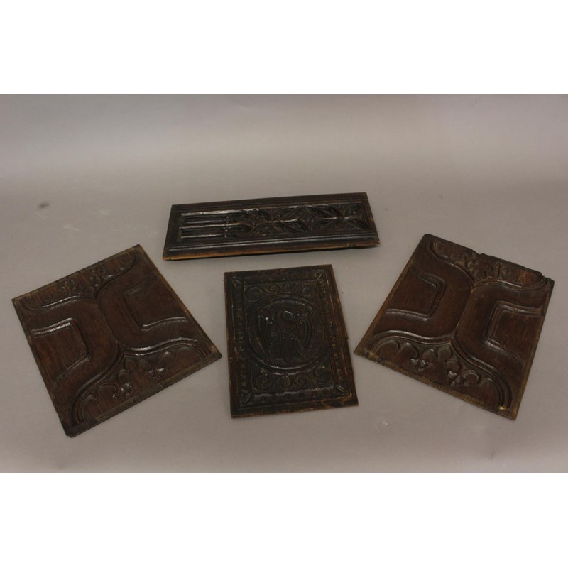 A pair of rectangular panels with gothic linen fold type carved panels with Gothic arches and trefoil foliage, 33.5 x 25cm, a smaller panel carved with a swan, 27x 19cm and a panel of Gothic tracery. 41 x 16cm. (4)