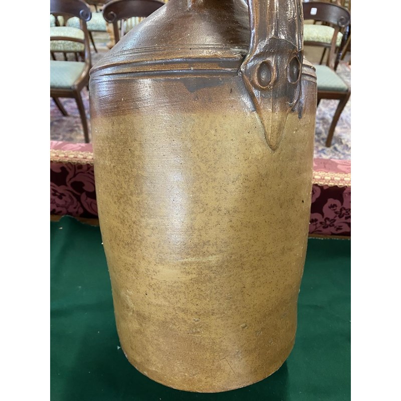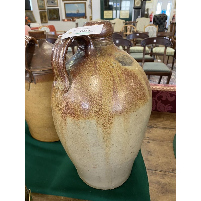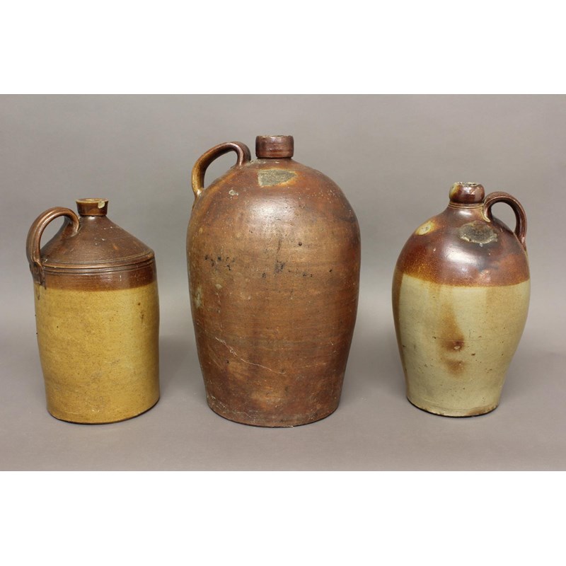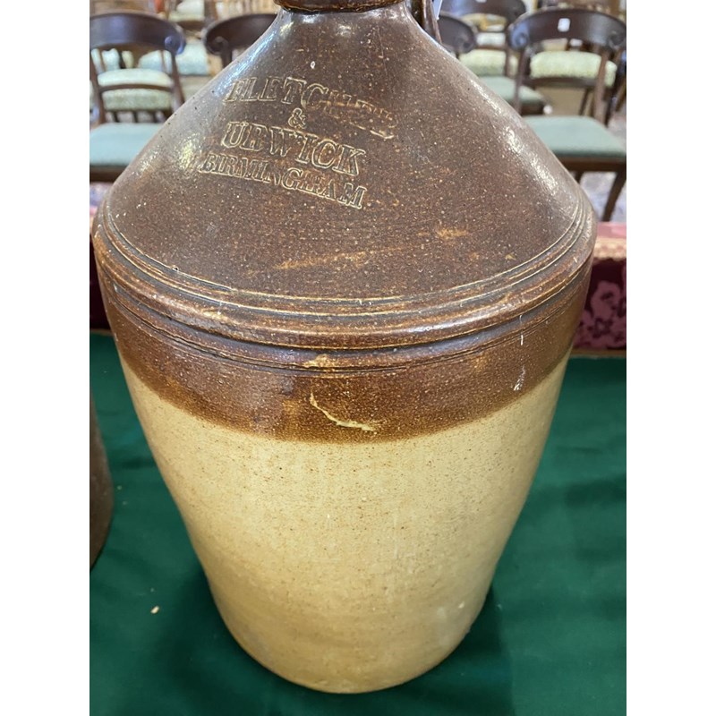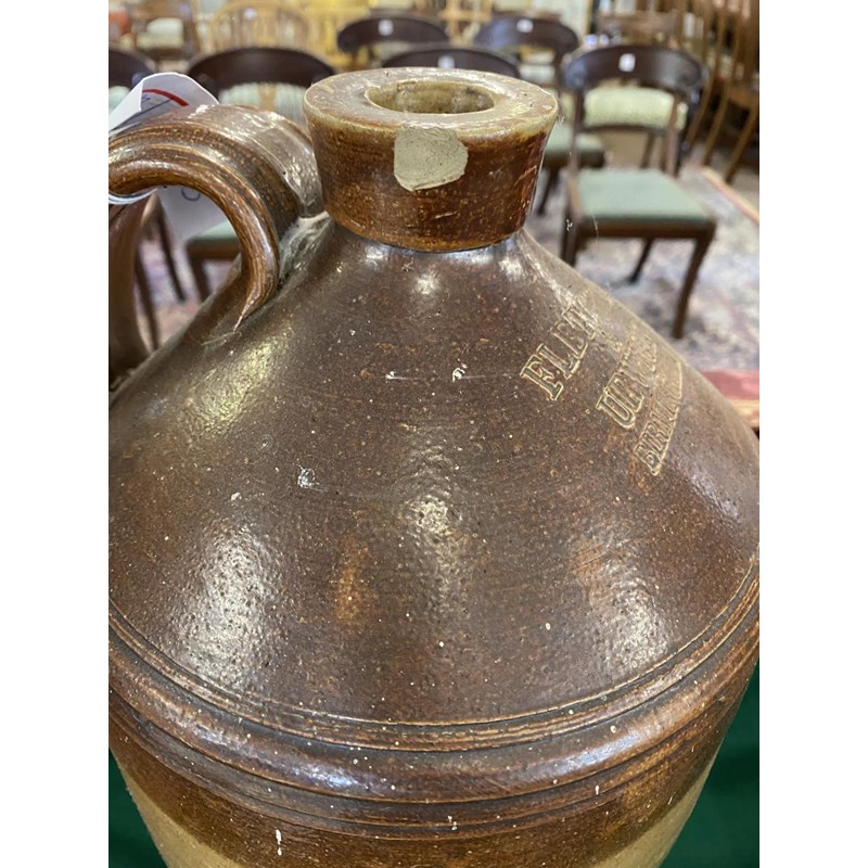 A large salt glazed stoneware flagon with narrow neck, loop handle and tapering body, 50cm high 30cm wide and two similar later flagons, one marked for Fletcher and Urwick of Birmingham. (3)