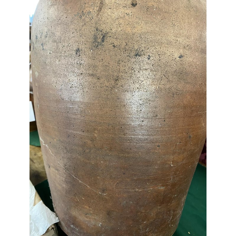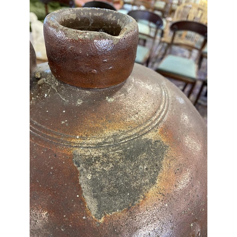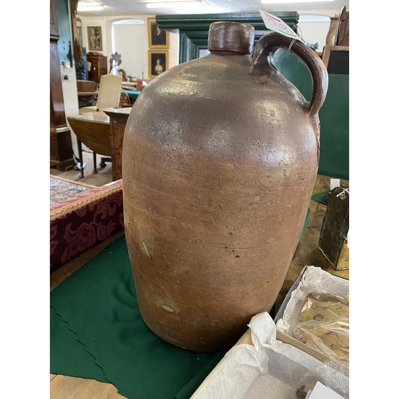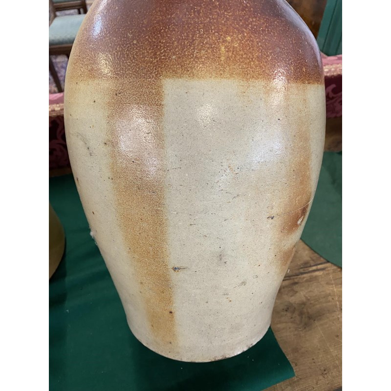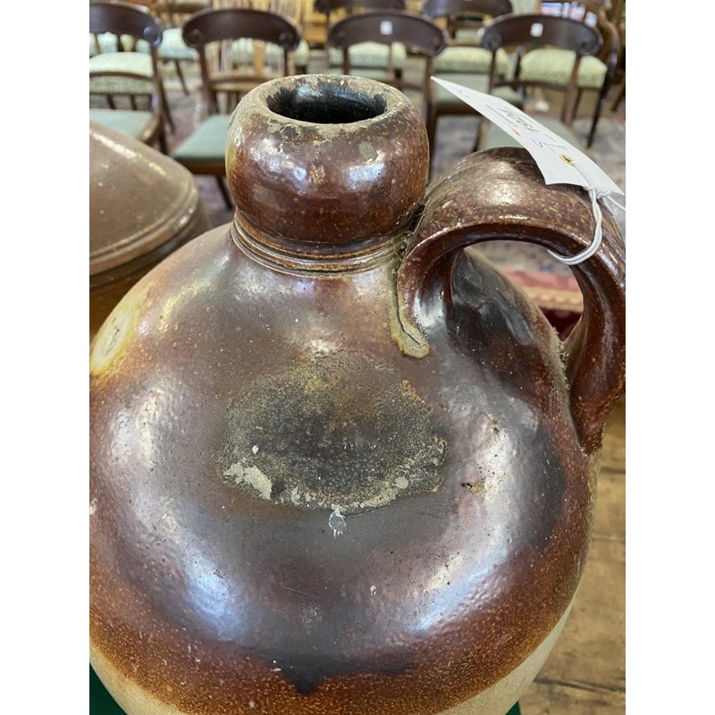 A large salt glazed stoneware flagon with narrow neck, loop handle and tapering body, 50cm high 30cm wide and two similar later flagons, one marked for Fletcher and Urwick of Birmingham. (3)