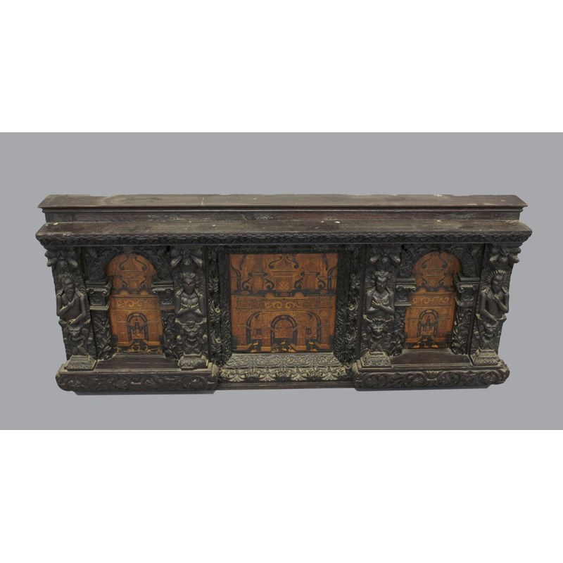 A fine carved and marquetry overmantel or part bedhead, with three marquetry panels of architectural 'Nonsuch' type buildings with arches, scrolling ornaments and pinnacles with swans swimming in the foreground, the panels within profusely carved oak surrounds with overhanging foliate cornice, two male and two female figures terminating in lion masks with broad rings in their mouths, surrounded by scrolling foliage and scrolls. 70cm high, 154cm wide.