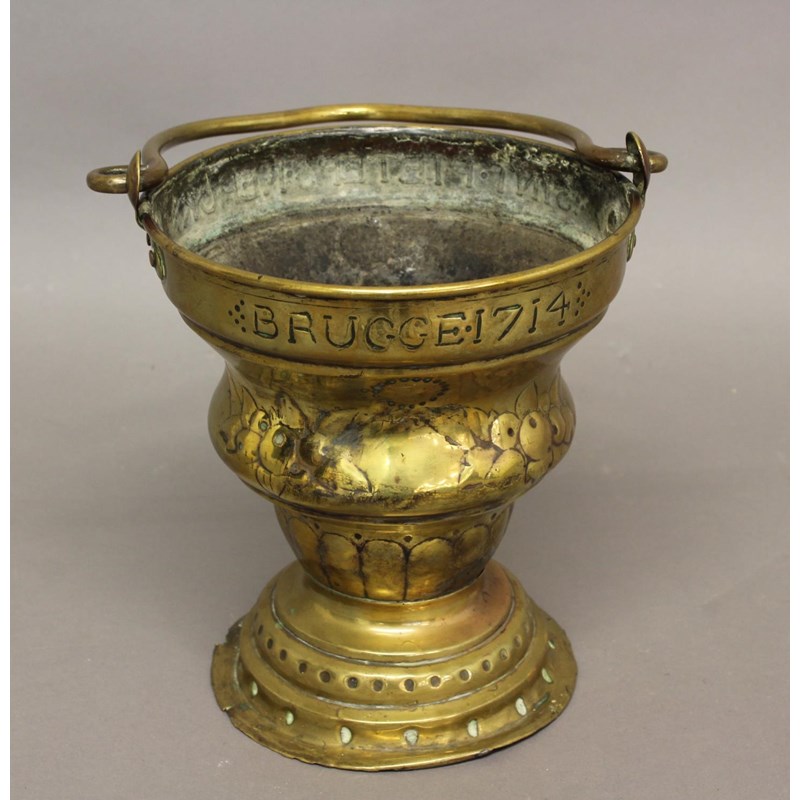 AN 18TH CENTURY BRASS SITULA MARKED FOR BRUGES. The bucket shaped form with swing handle above a rim marked 'SINT PIETERS KERCK BRUGGE 1714', the bucket of waisted form with foliate and fruit swags, on a spreading circular foot, 43cm high (with handle up) and 26cm wide.