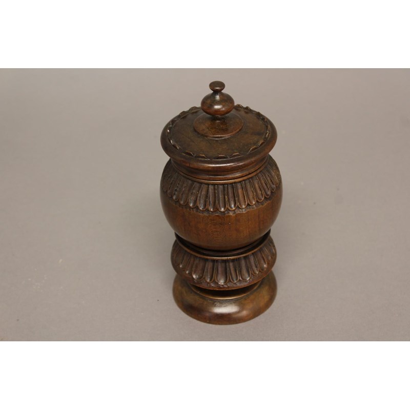 A MID 18TH CENTURY FRUITWOOD SPICE BOX AND COVER. Of turned form with a 'pull off' lid with central finial and raised border, the body with fluted decoration and narrow turned support on spreading base, 18cm high 8cm wide.