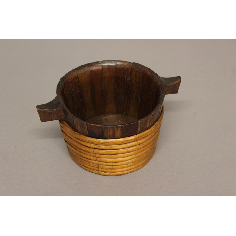 A 19TH CENTURY SCOTTISH STAVED COG. A small straight sided drinking vessel of upright staves bound with willow to the outside, with two small projecting side handles, 8.5cm high, 18cm wide.