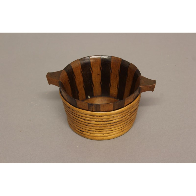 The bowl of staved construction with alternating staves of sycamore and alder, with feather joints to the staves and bound with willow, of straight sided form with two short projecting handles, 7.5cm high, 16cm wide.