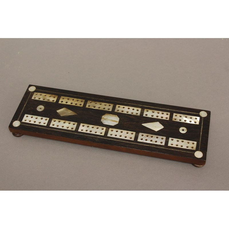 A LATE 19TH CENTURY ROSEWOOD AND MOTHER OF PEARL CRIBBAGE BOARD.