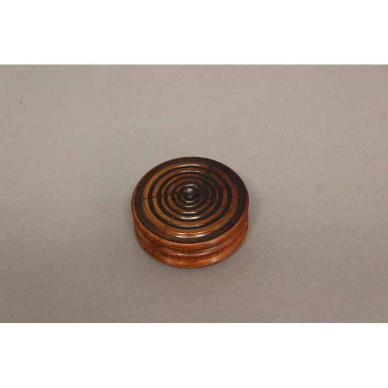 A 19TH CENTURY TURNED WOODEN SEAL BOX. Of circular turned form with ring turned lid and smooth base, the close fitting pull off lid revealing a shallow interior, 2cm high, 6.5cm wide.