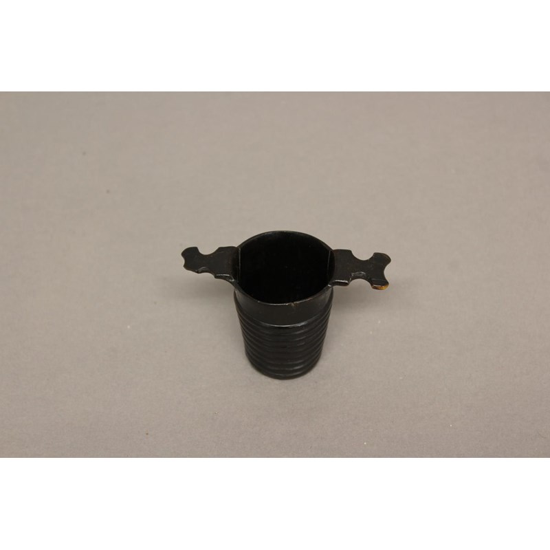 A SMALL 19TH CENTURY HORN BEAKER. Of straight sided form with turned ringed decoration, the top with twin shaped flat handles, 5.5cm high 8cm wide.