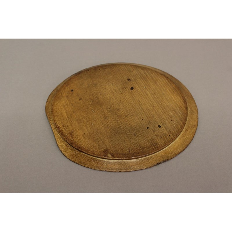 A 19TH CENTURY PLATTER. A circular wooden platter or bread board eith tapering rim and signs of much use to either surface, 27cm wide.