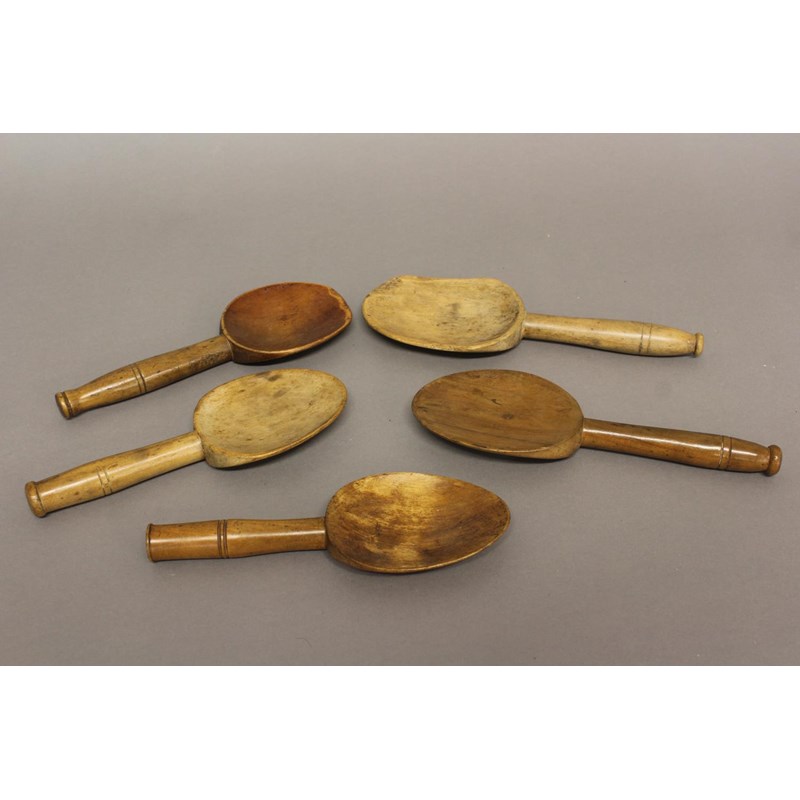 Five 19th century Welsh butter spoons, each with broad shallow bowls on short turned handles with vairied ringed decoration, 26cm long, 9cm wide and similar. (5)