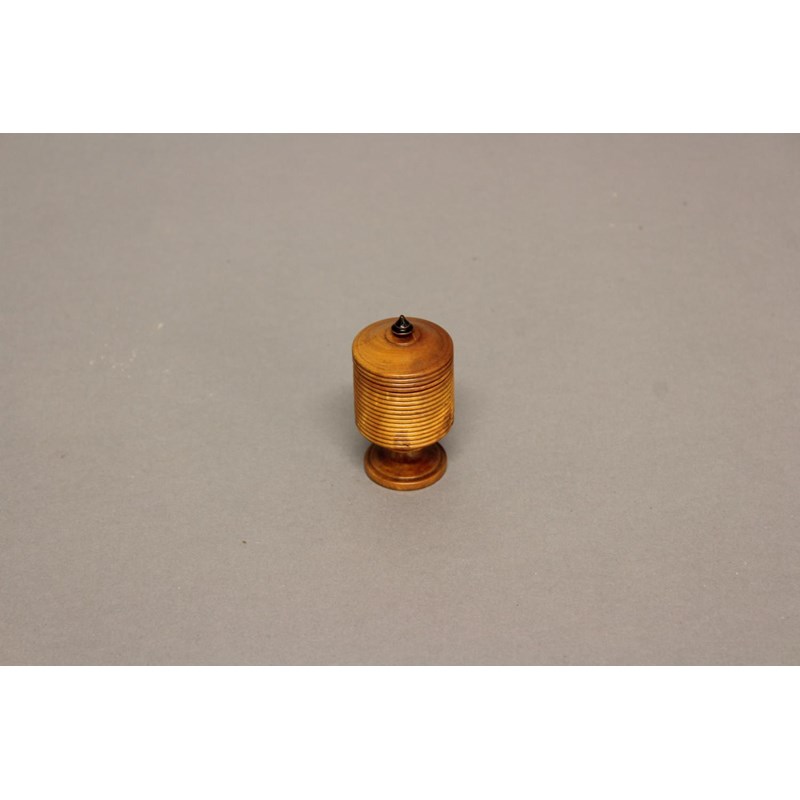 Of ring turned form on a pedestal foot with spreading base, the pull off lid with ebonised finial, the top revealing a shallow well, this detaching to reveal a further recess, 7cm high, 4cm wide.