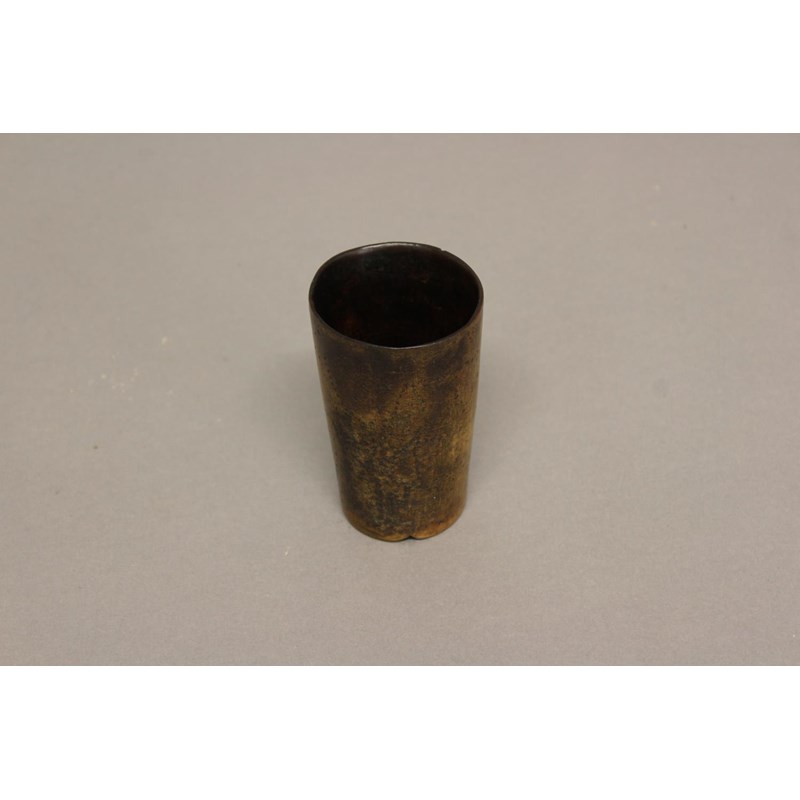 A 19TH CENTURY HORN BEAKER. Of straight sided tapering form with pricked decoration, 9cm high 5.5cm wide.