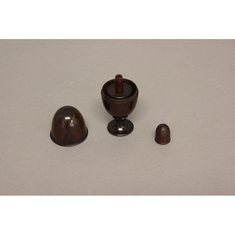 A 19TH CENTURY TURNED NEEDLEWORK BOX. Of egg in an egg cup form with a pull of lid revealing a thimble and double thread reel, 9cm high, 4.5cm wide.