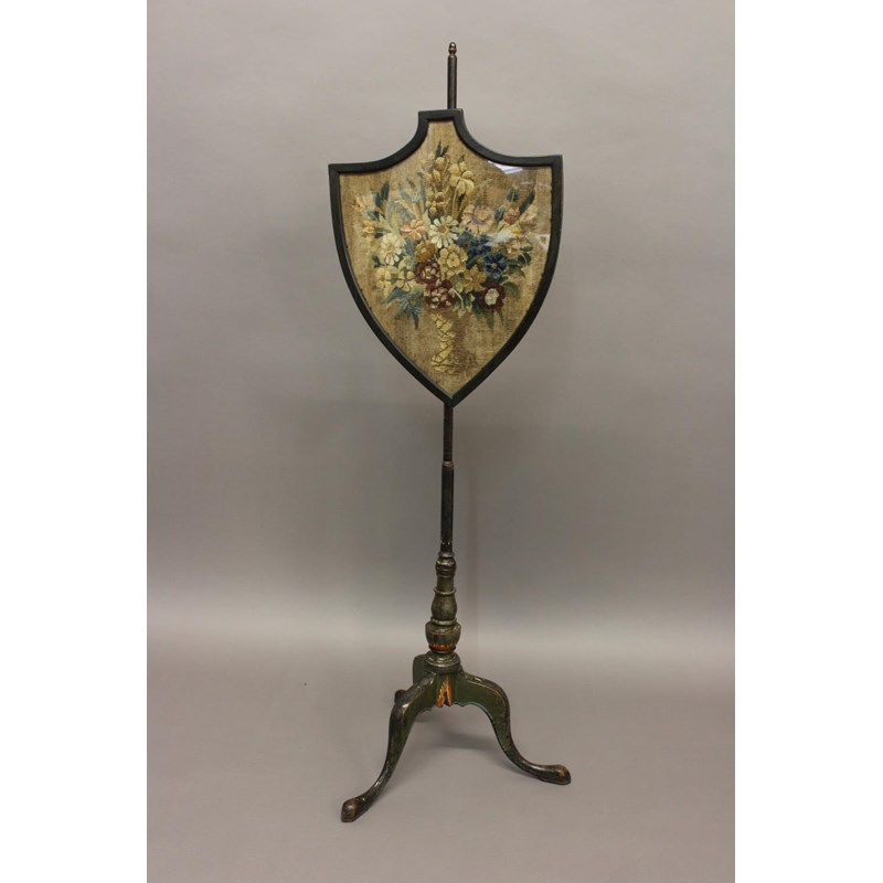 A pole screen with adjustable shield shaped panel retaining the original floral needlework, on a turned column and three downswept slender cabriole legs with pointed pad feet and original painted decoration with leaves against a green ground. 142cm high, the needlework panel 53 x 42cm.