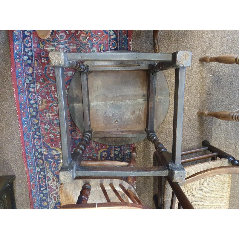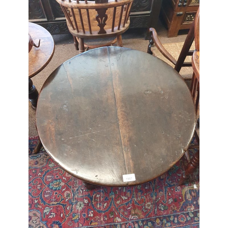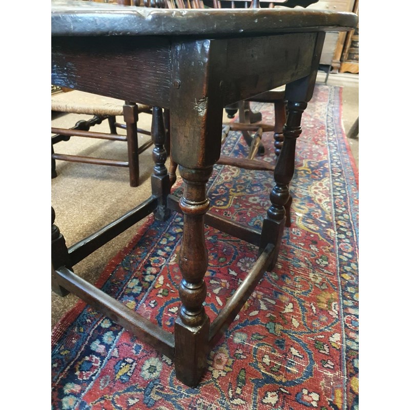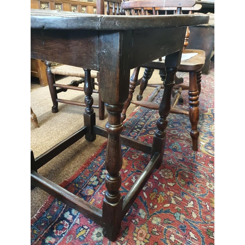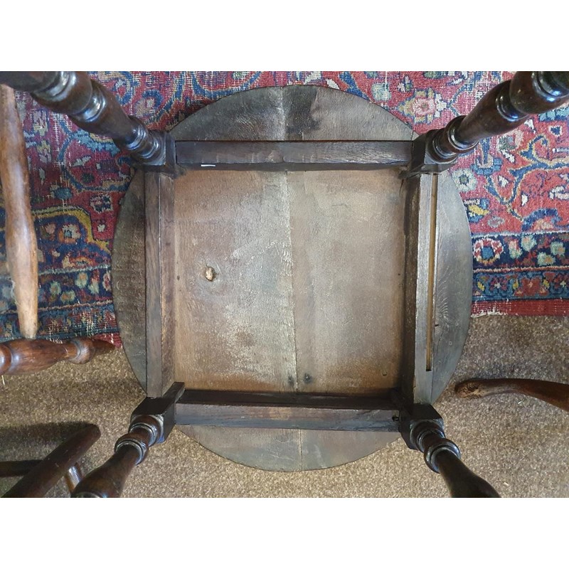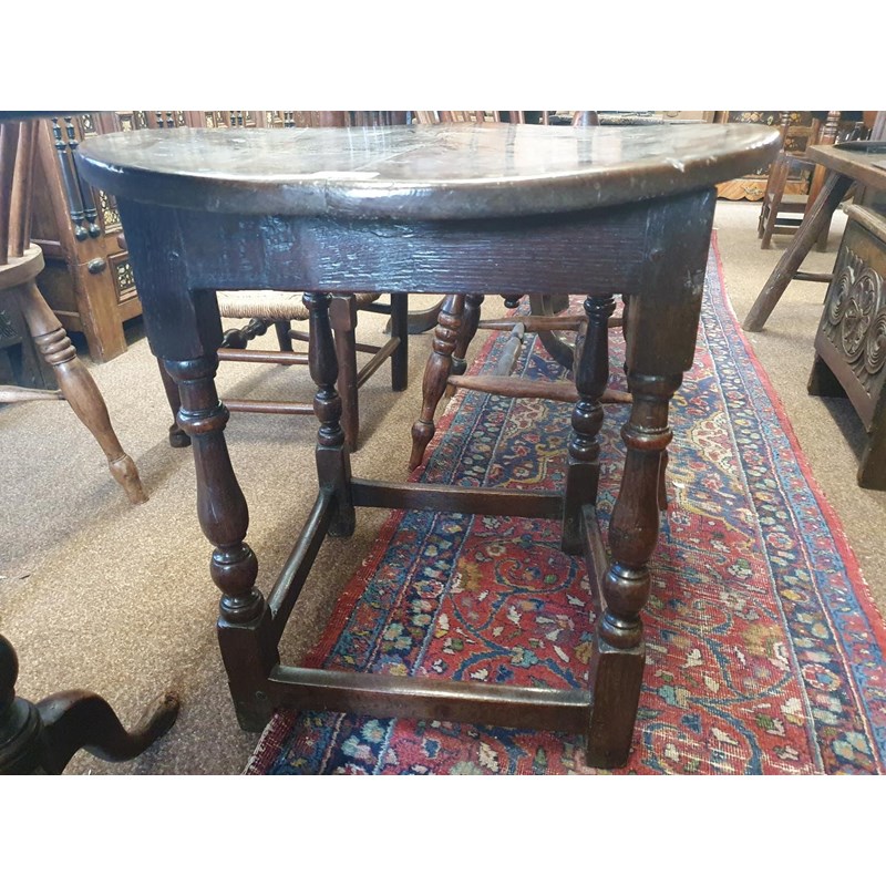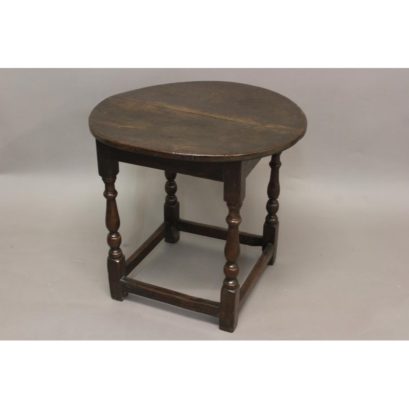A LATE 17TH CENTURY OAK CENTRE TABLE. With a slightly irregular circular two plank top above a shallow frieze, on four turned legs with rectangular stretcher, 62cm high, 66cm wide.