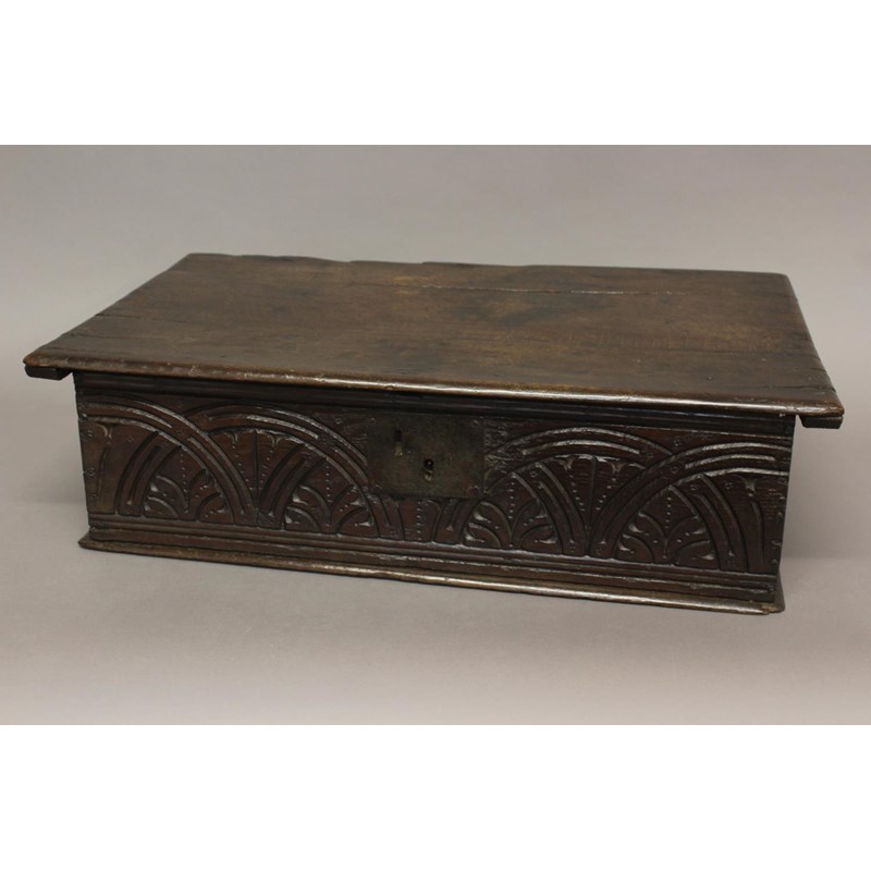 With a broad rectangular lid with curved border, the front and side panels with lunette carved and punched decoration, on a moulded border, probably West Country manufacture, 19cm high, the top 68 x 40cm.