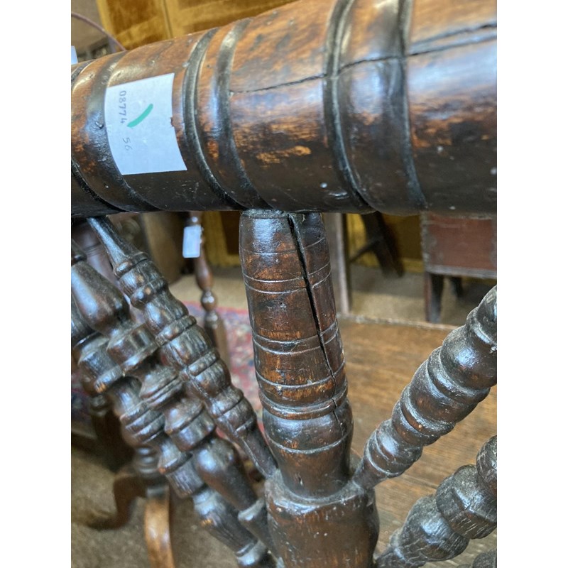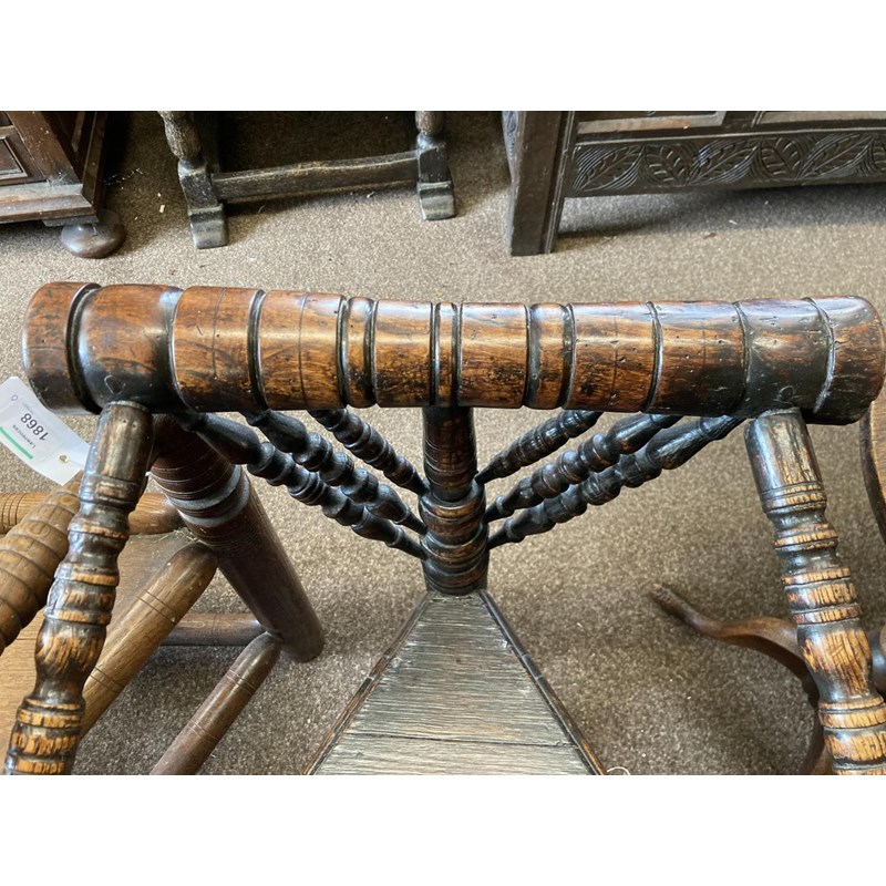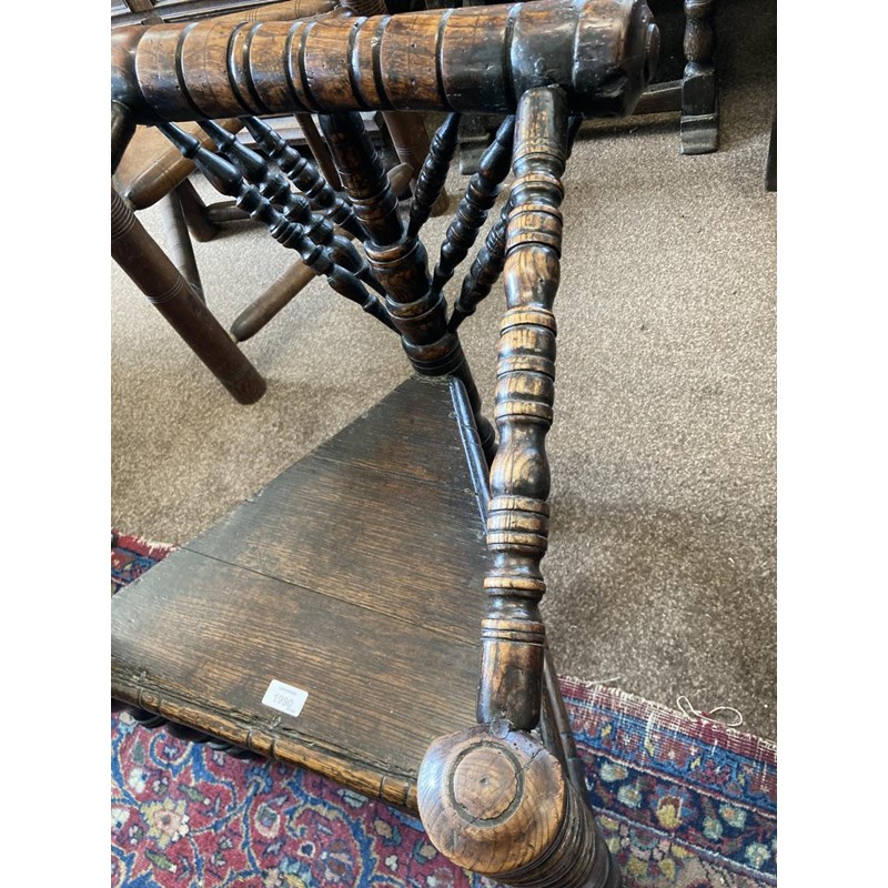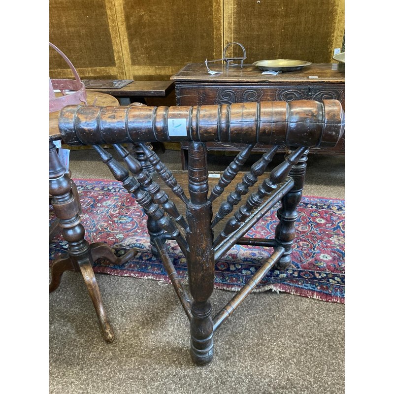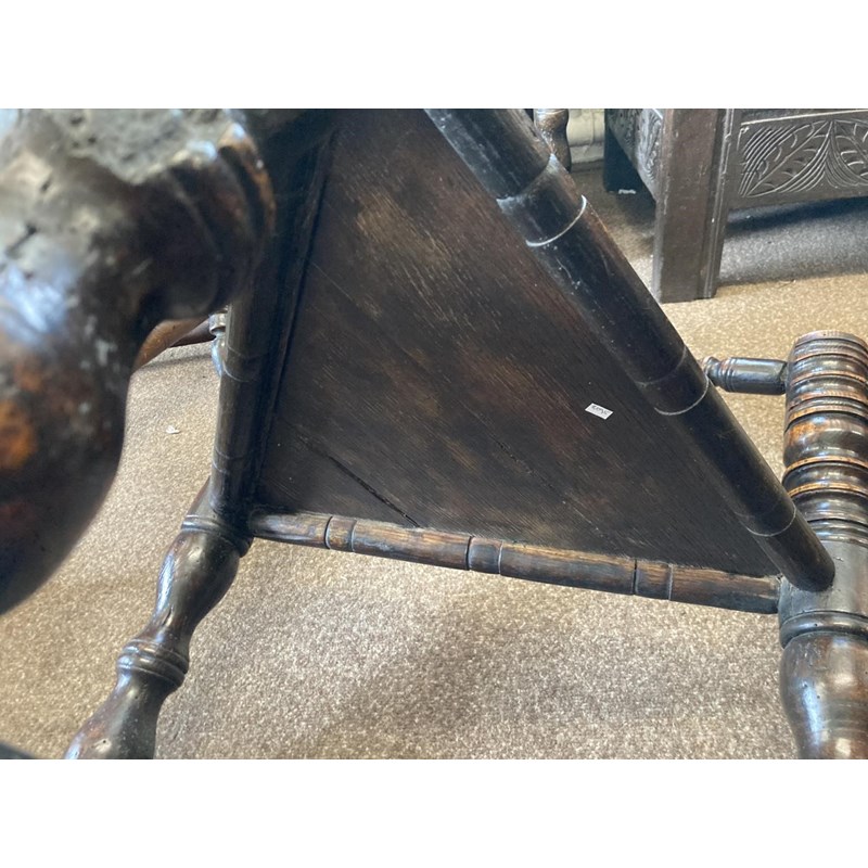 An ash and oak turners chair with a broad turned top rail with ringed decoration, tapering towards the centre, on a tapering back leg with radiating turned uprights, with similar arm supports above a solid triangular seat on heavy turned front legs, 75cm high, 60cm wide and 51cm deep.