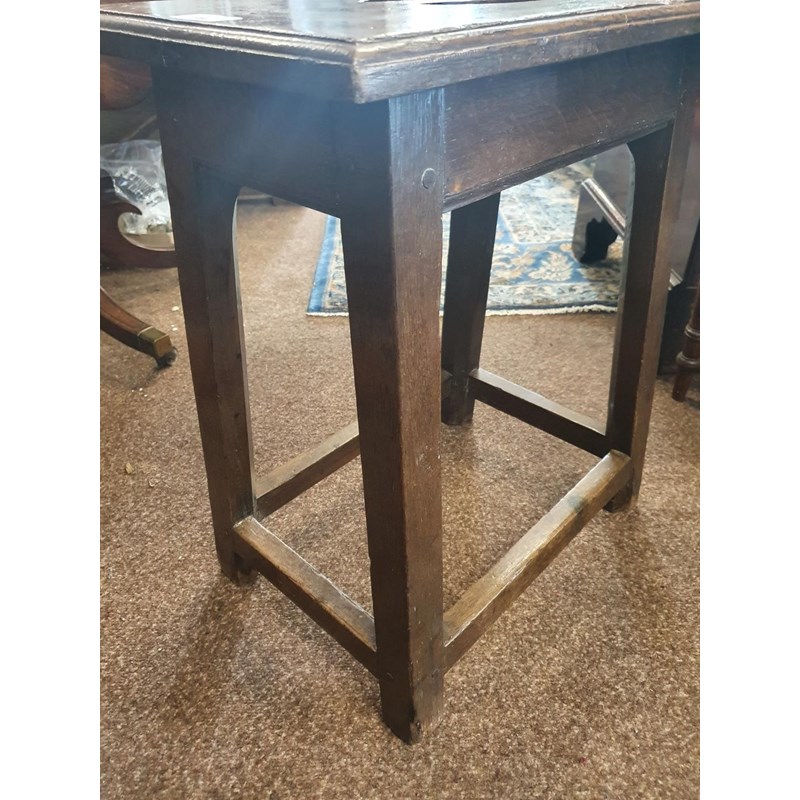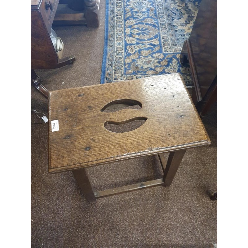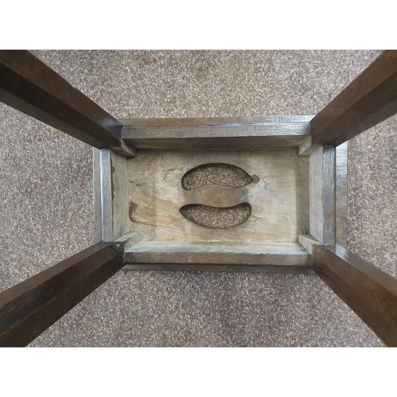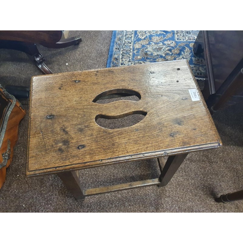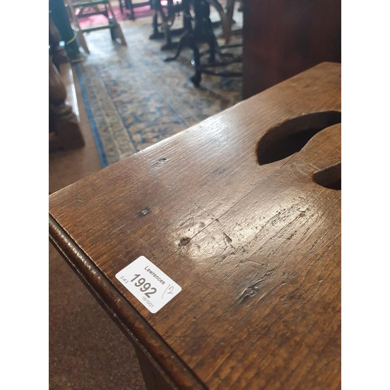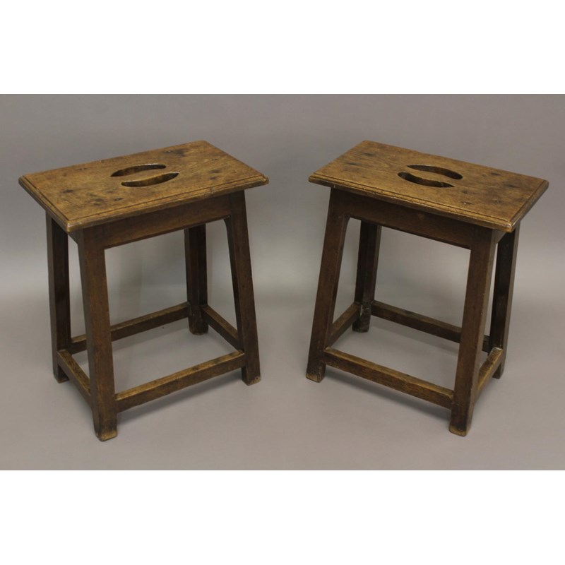 With rectangular tops with moulded borders and pierced hand grips to the centre, on undecorated splayed square section legs and stretchers, probably West Country manufacture, 55cm high, the tops 48 x 29cm. (2)