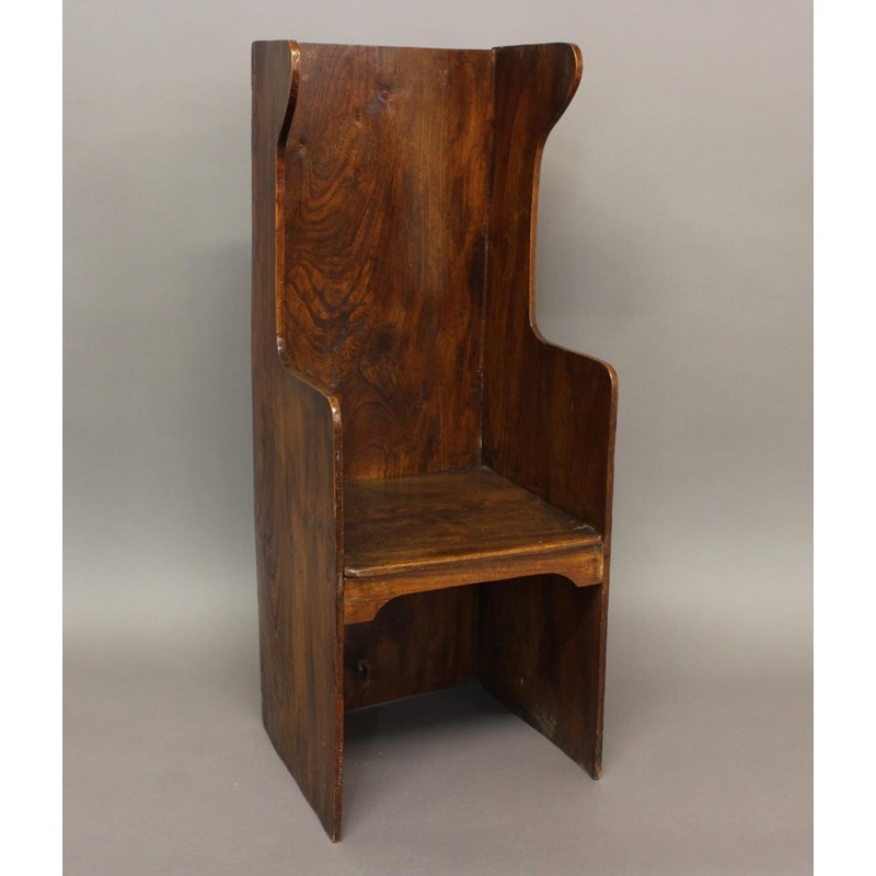 A child's chair of unusual boarded form with a tall rectangular back, shaped sides with projecting tops and solid seat, probably West Country manufacture, 86cm high, 33cm wide, 32cm deep.