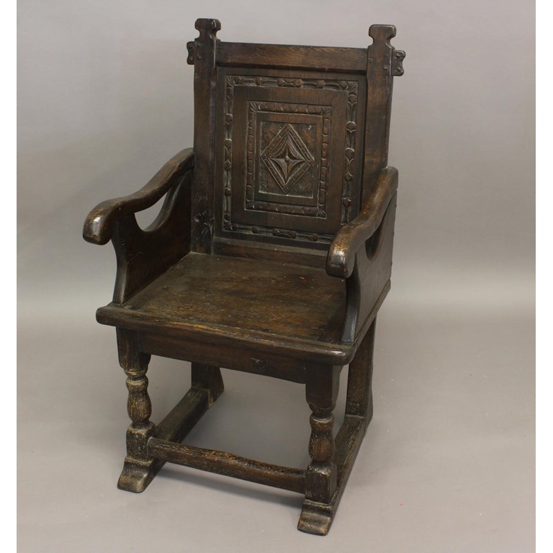 AN OAK ARMCHAIR OF 16TH CENTURY DESIGN with carved back
