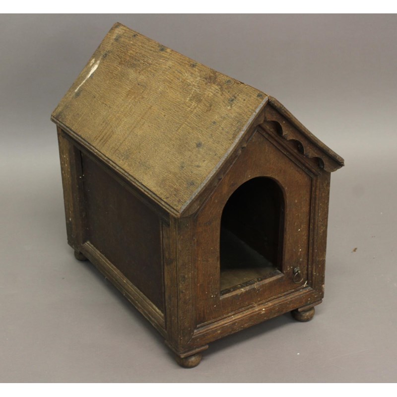 AN OAK DOG KENNEL with panelled sides and gabled roof, probably 19th century; 49 x 48 cms