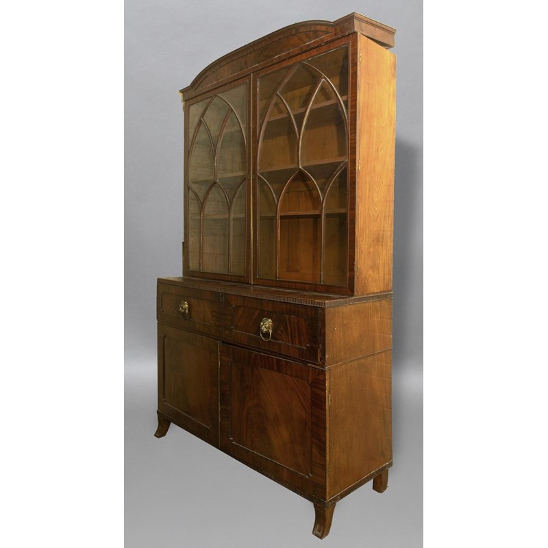 The upper section with an arched cornice above twin glazed doors with pointed arch-topped glazing bars, enclosing a shelved interior, the lower section with a secretaire drawer fitted with short drawers and pigeon holes, with lion mask ring handles, above twin panelled doors, horizontal moulding and short panel fronted sabre legs, 243cm high, 128cm wide and 50cm deep.