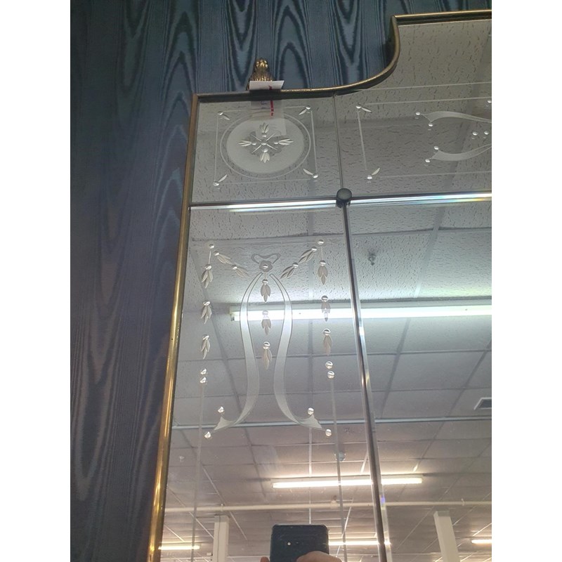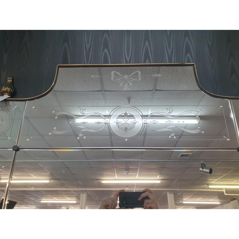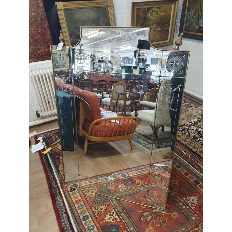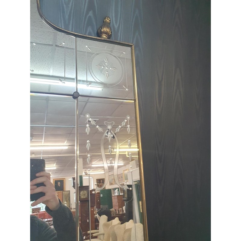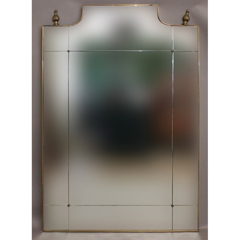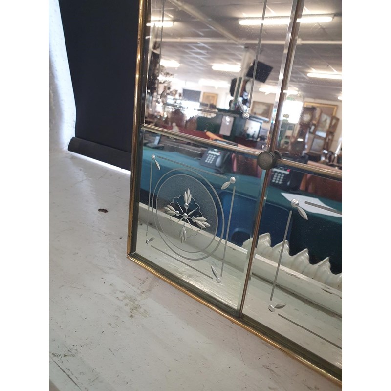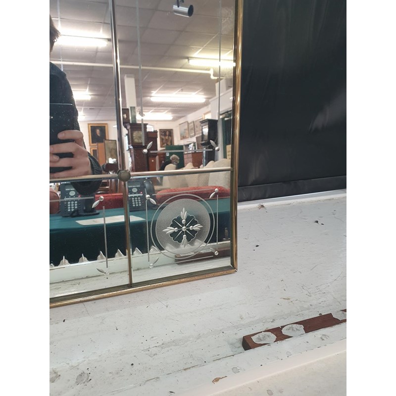 With a central bevel edged rectangular plate surrounded by nine similar plates with neo-classical style etched decoration, within a brass surround with twin urn ornaments, 132 x 90cm.