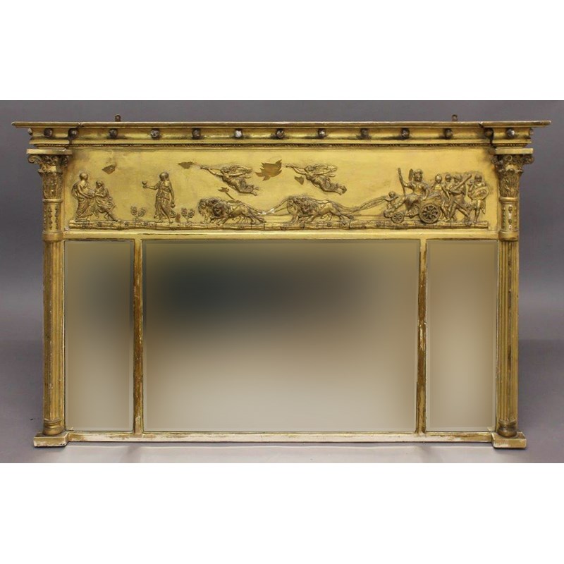 With three rectangular bevel edged plates between column sides with scrolling capitals and below a frieze decorated with a scene of a chariot being pulled by lions with trumpet blowing angels above, beneath a frieze with gilt ball decoration, 142cm wide and 92cm high.