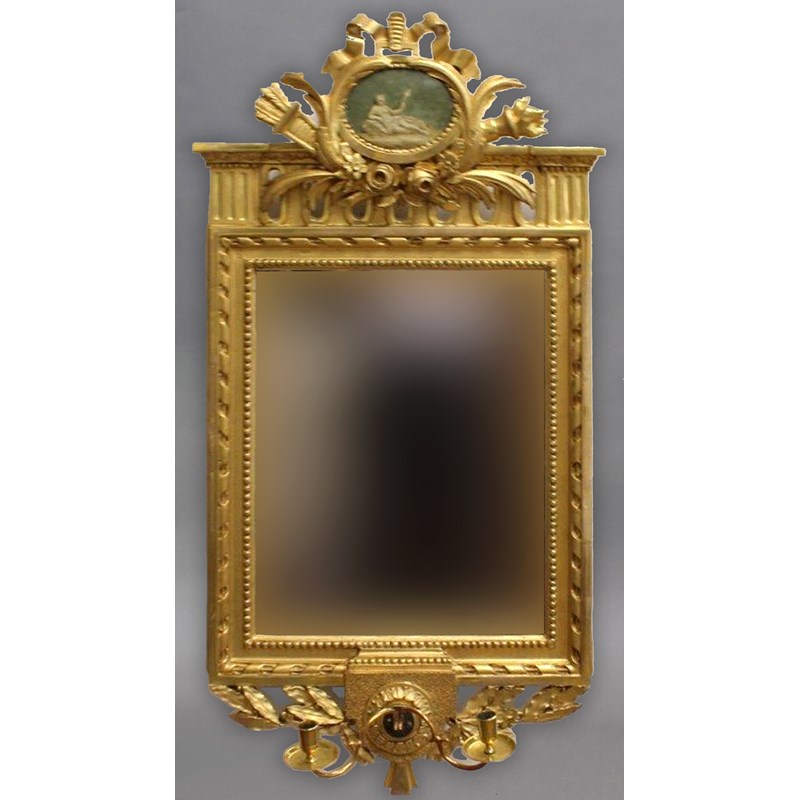 With a rectangular bevel edged plate with a ribbon carved frame with an elaborate cresting with an oval panel painted with a reclining classical figure and above leaf carved decoration and twin scrolling candle branches, 98 x 54cm.