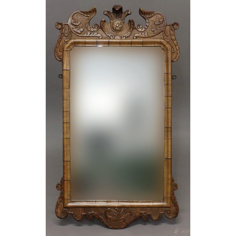 A GEORGE II STYLE CARVED WALNUT MIRROR. With a rectangular mirror plate within a moulded border with carved cresting above and below with scroll and leaf decoration, 93cm high x 52cm wide.