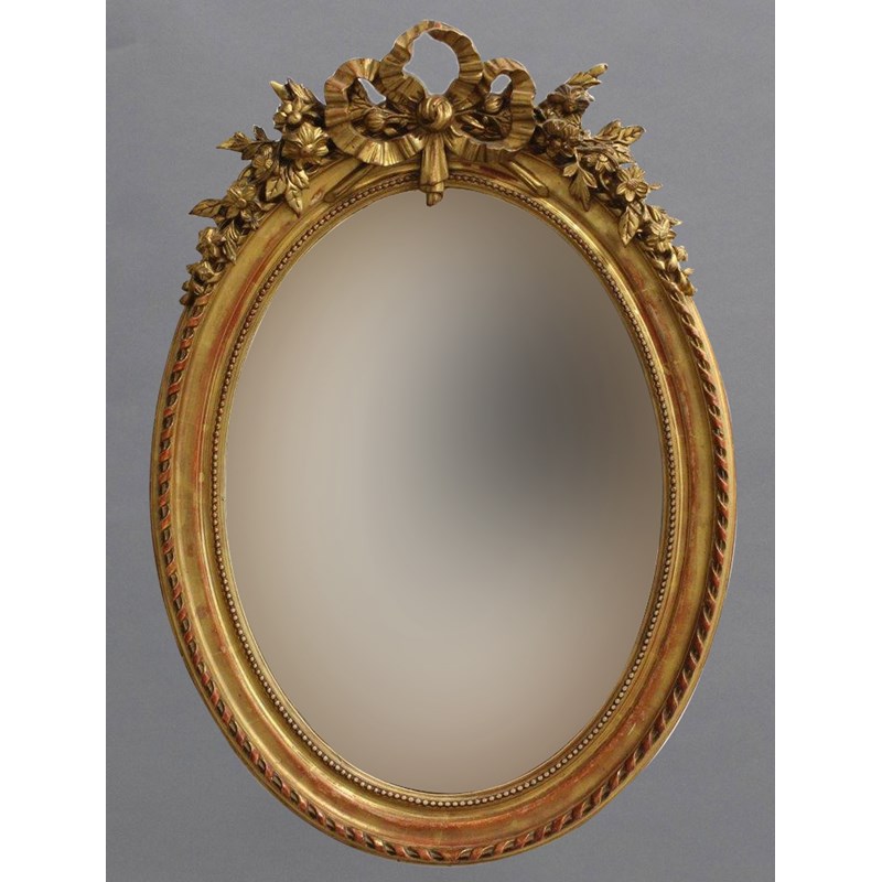 A VICTORIAN GILT FRAMED OVAL WALL MIRROR. With a bevel edged oval plate within a beaded and moulded gilt frame with elaborate ribbon tied and foliate cresting, 90cm x 63cm.